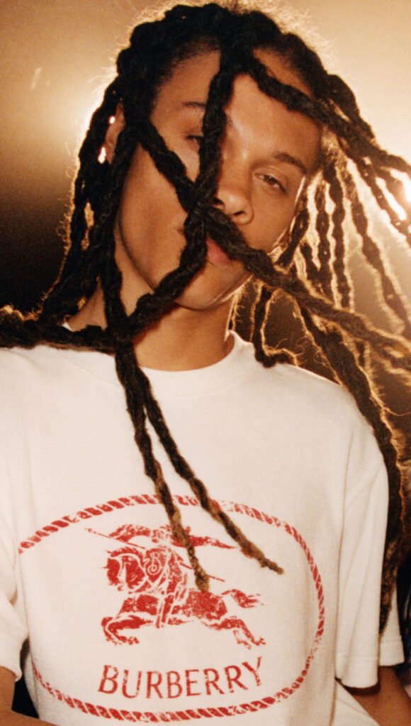 In the campaign, Loyle moves slowly, eyes scanning, voice steady. He wears Burberry with a sense of understated authority. His presence doesn’t shout—it speaks truth. Among the chaos of festival noise, he is the clarity—a verse whispered into the storm.