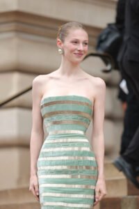 Hunter Schafer, celebrated for her roles on screen and in fashion, chose a more architectural approach — a minimalist yet complex white suit with curved, sculptural panels that evoked both armor and organic sculpture. Schafer’s look underlined her status as a chameleon-like muse of the fashion world, constantly shifting between ethereal delicacy and bold structure.