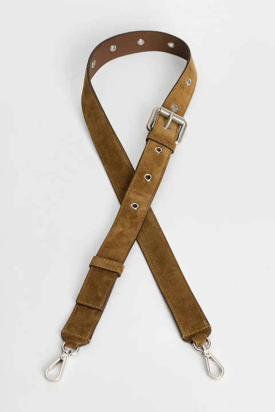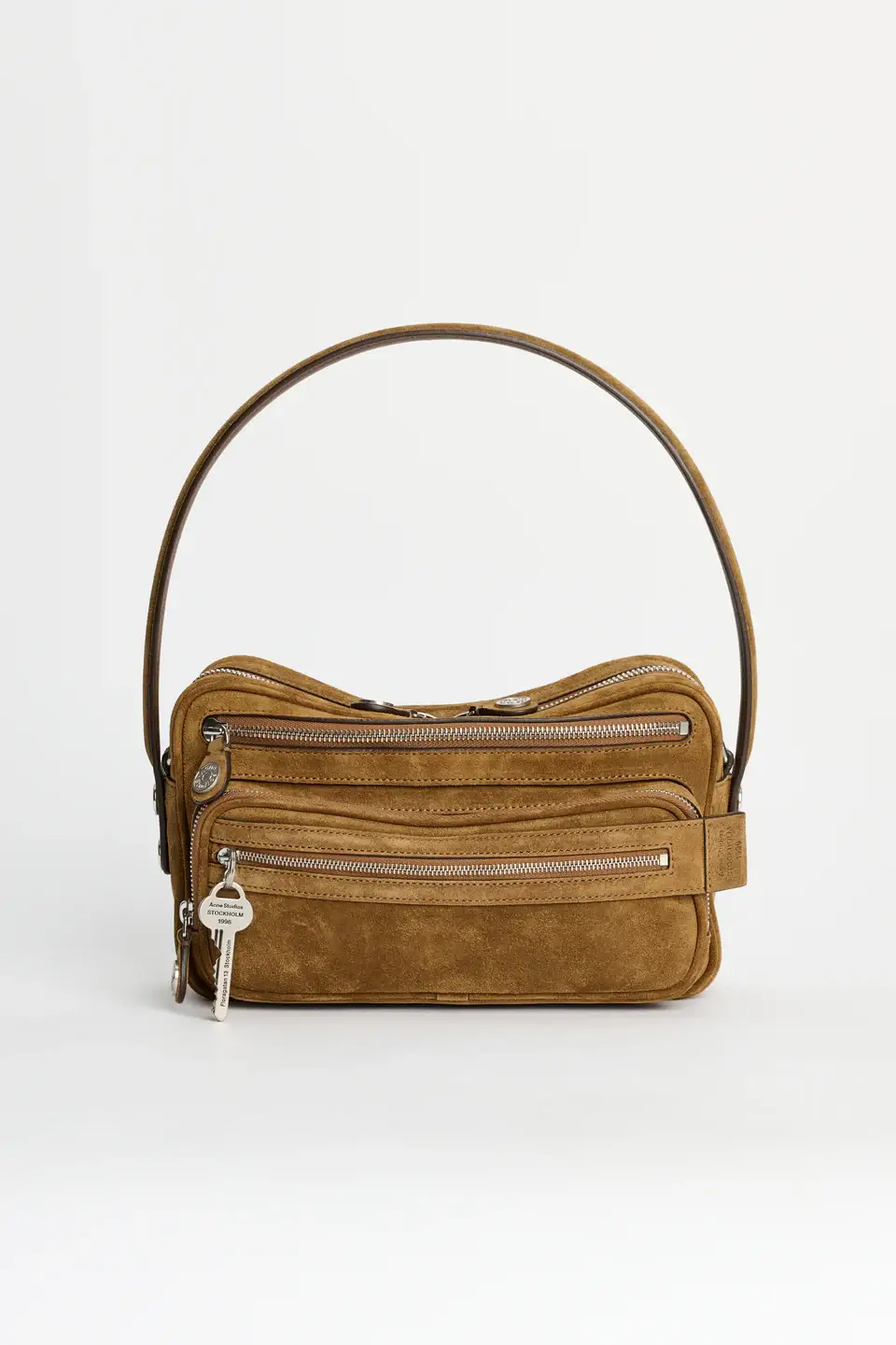 There is a precision to the way Acne Studios constructs objects—never overt, never indulgent in excess, but consistently attuned to proportion, tactility, and lived use. The Camero Party bag in cognac suede operates within this discipline.