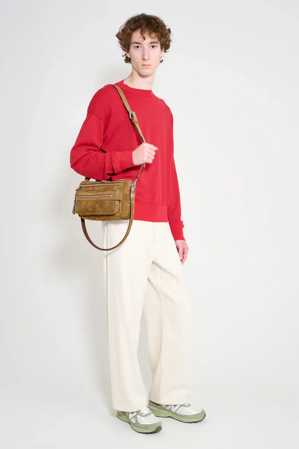 Worn on the shoulder, it appears composed—almost archival, echoing vintage equipment bags. The shorter strap keeps it close to the body, controlled and intentional.