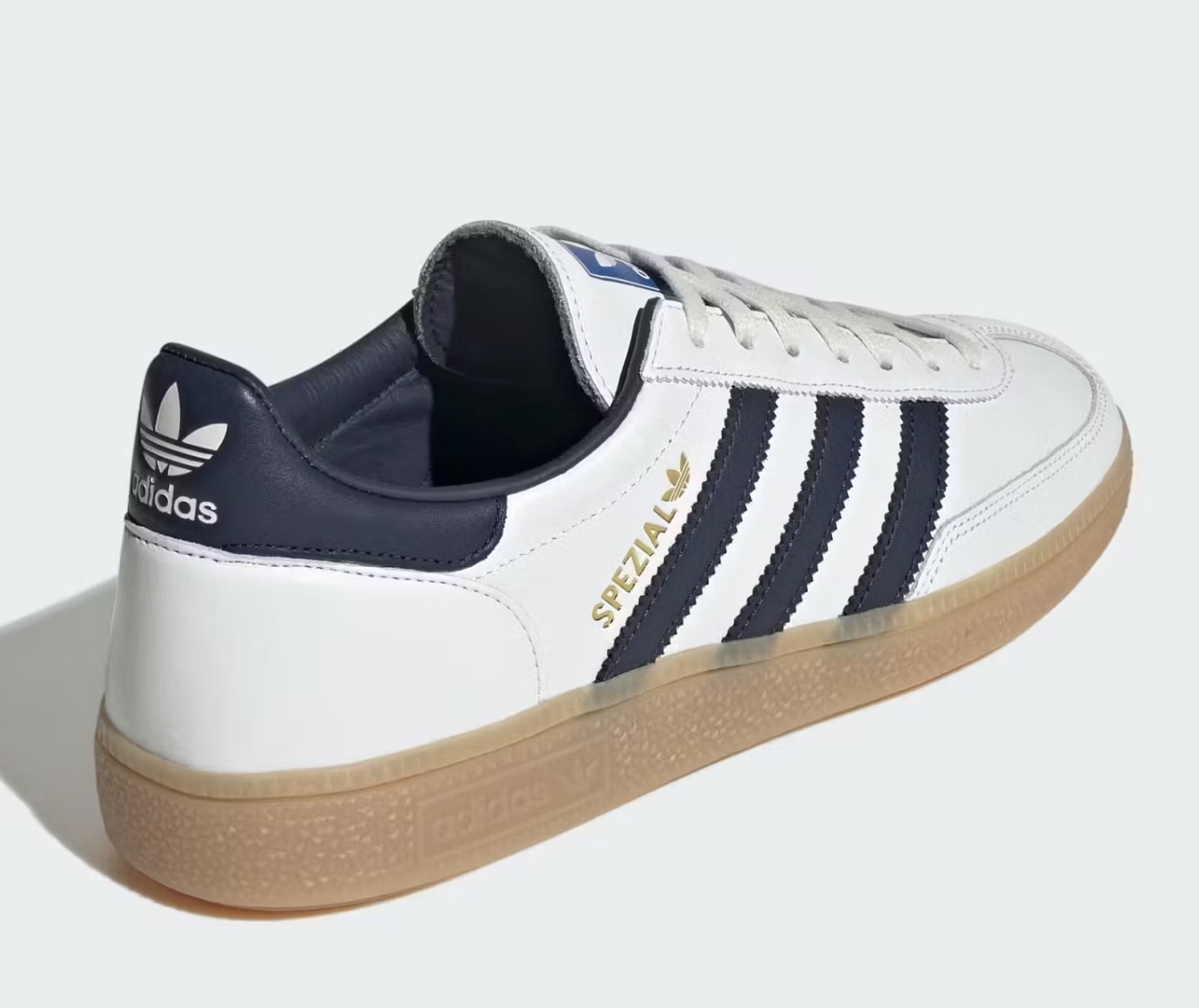 Gold-foil “SPEZIAL” lettering gleams on the lateral panel, accompanied by a tonal navy heel tab embossed with the Trefoil. Even the box gets the premium treatment: an embossed, textured white construction with “MADE IN_” branding that elevates the unboxing into an event. Inside, extra navy laces and a small Trefoil keychain nod to collectors who relish details.