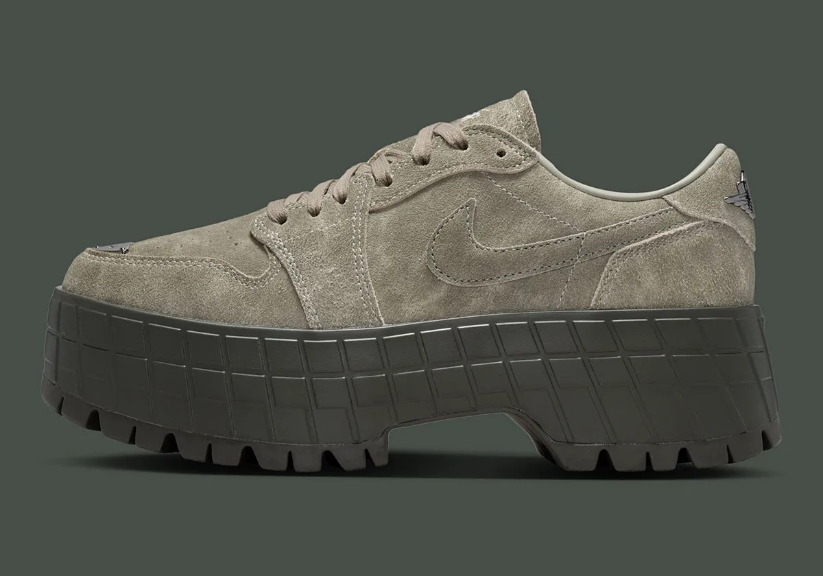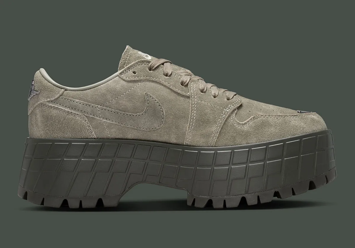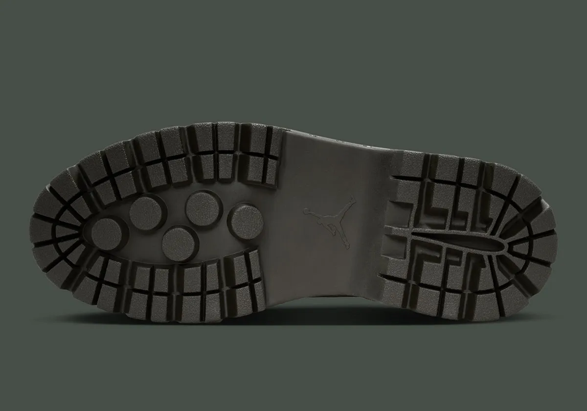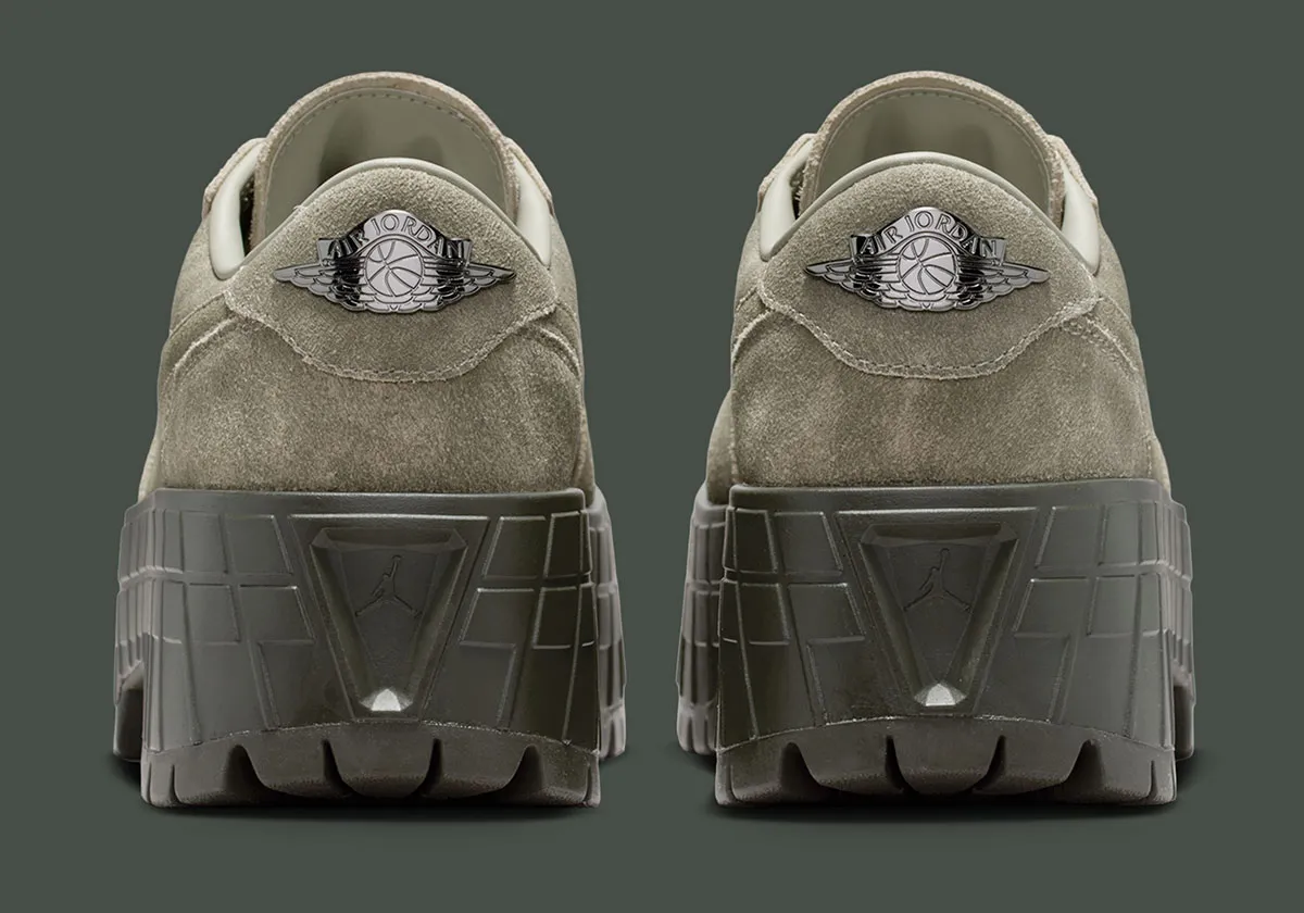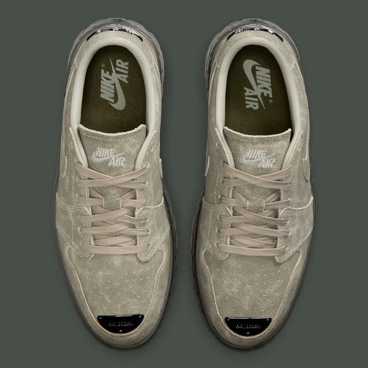 The “Cargo Khaki” execution—layered with “Spruce Fog”—doesn’t attempt to convert skeptics. It doesn’t brighten, exaggerate, or overcompensate. Instead, it leans further into what the Brooklyn already is: a reconfiguration of the Air Jordan 1 that prioritizes stance over speed, presence over performance.