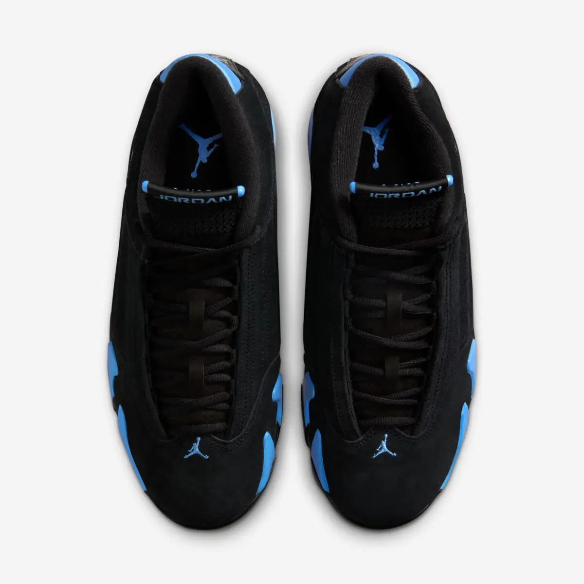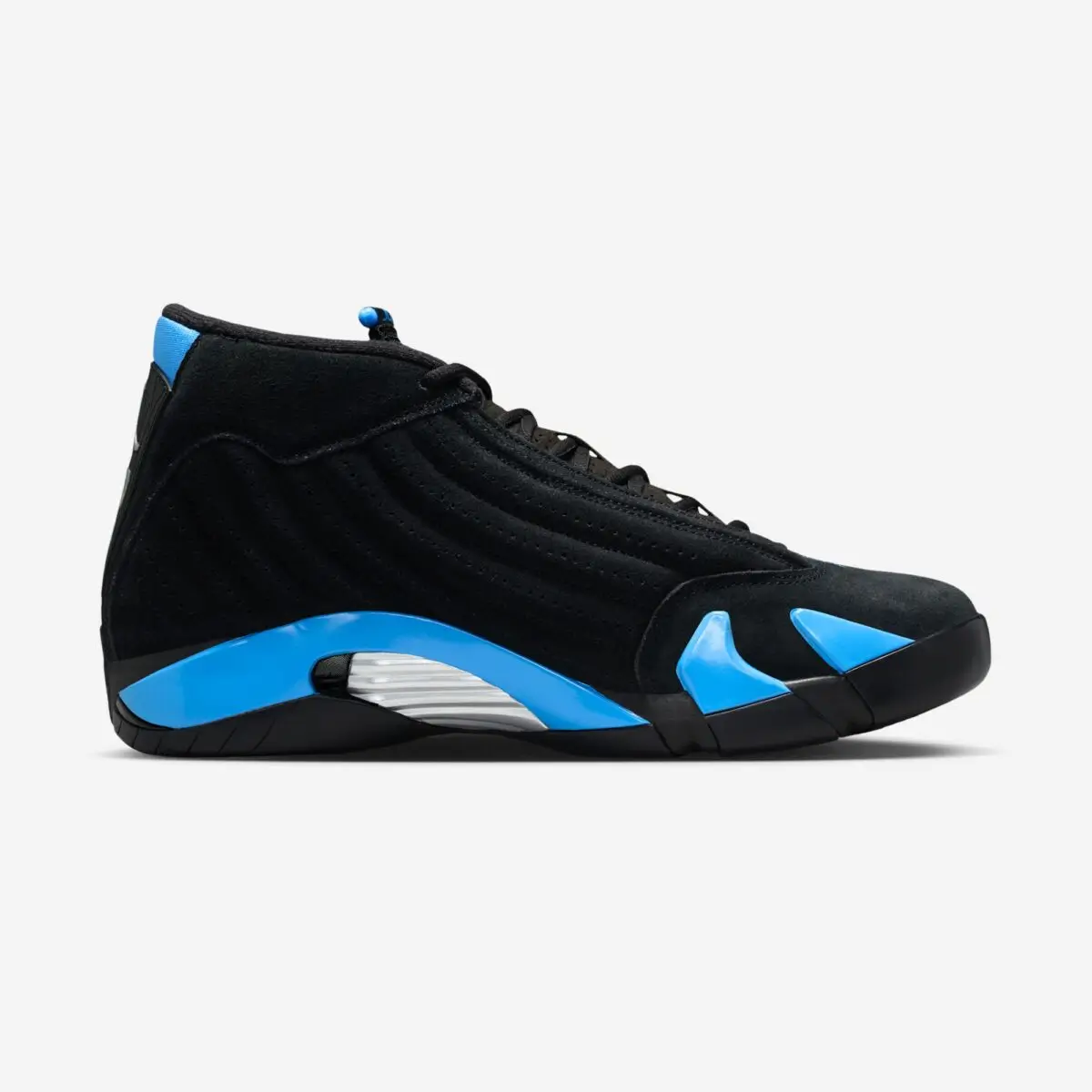 The upcoming Air Jordan 14 “University Blue” stays loyal to the original design language. The shoe features an all-black upper constructed from premium nubuck, creating a smooth and stealthy base. Against this dark backdrop, University Blue accents appear across key areas of the shoe, bringing a vibrant contrast that instantly catches the eye.