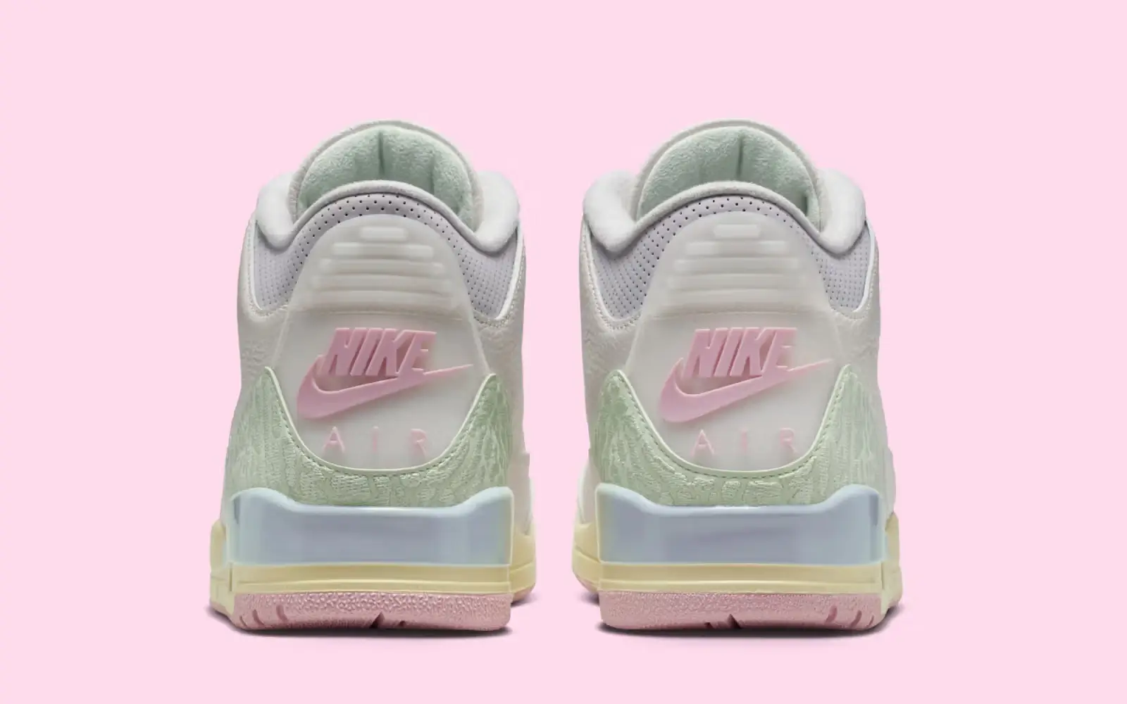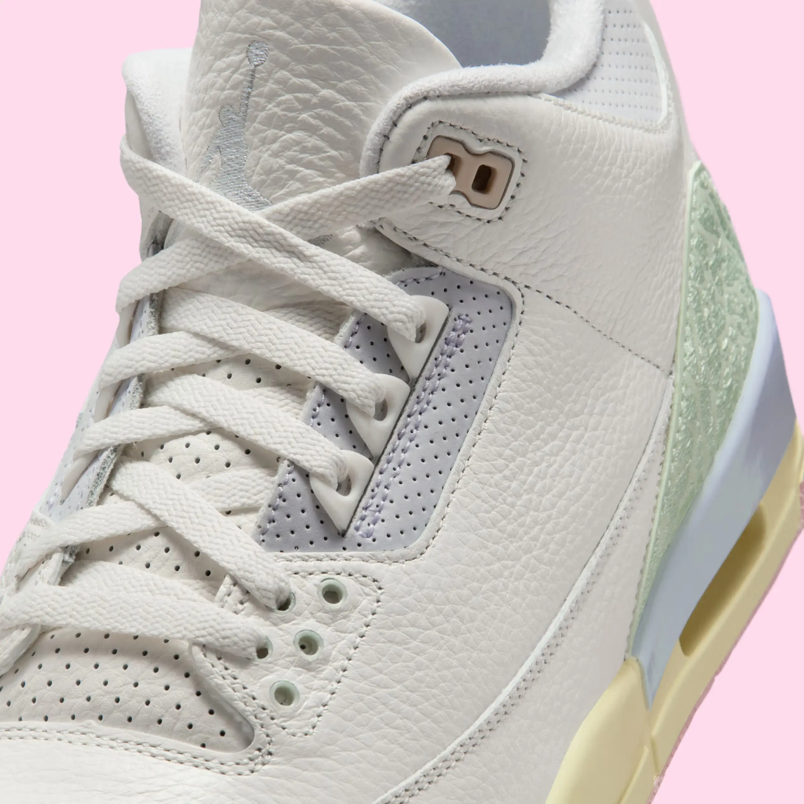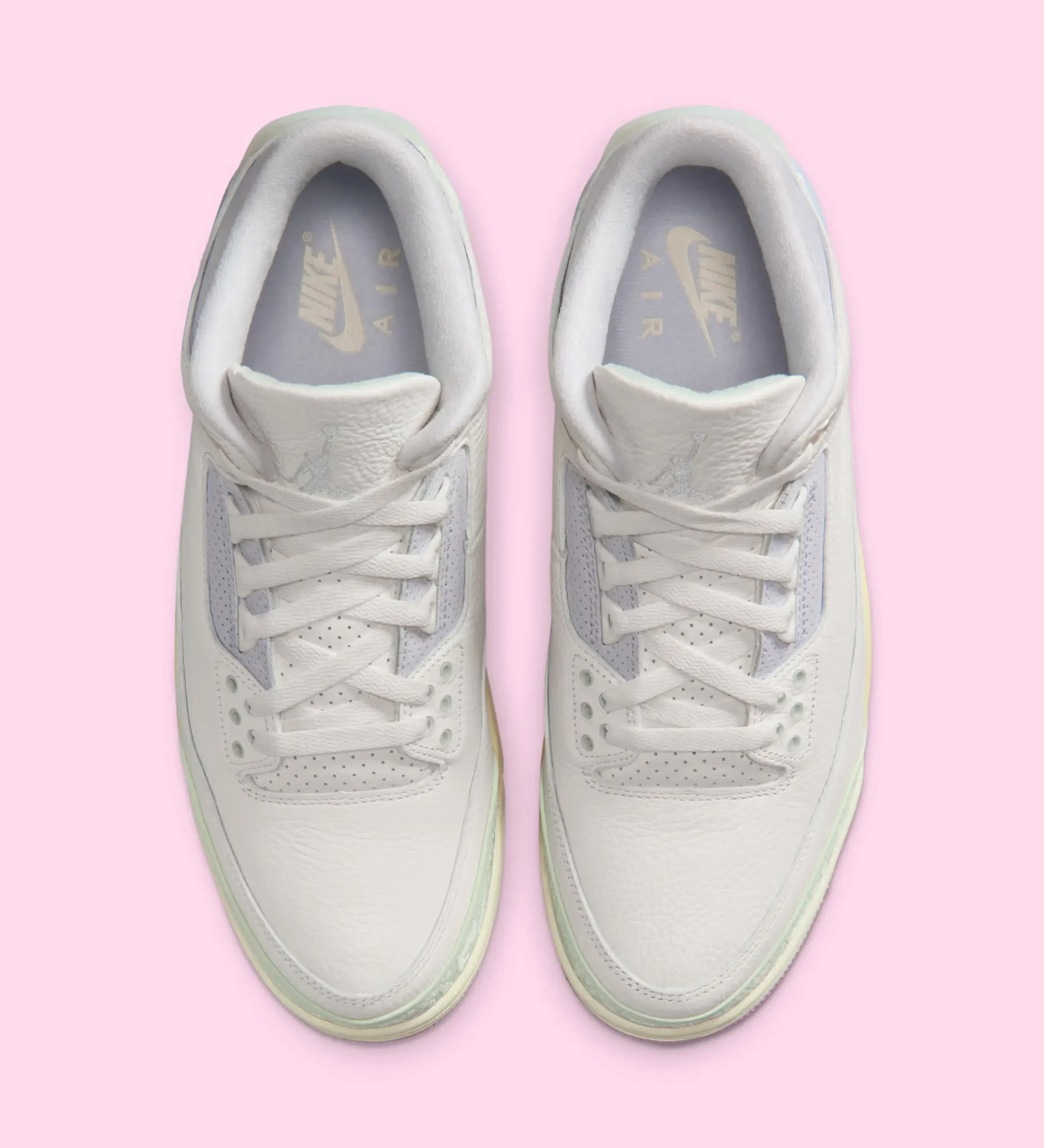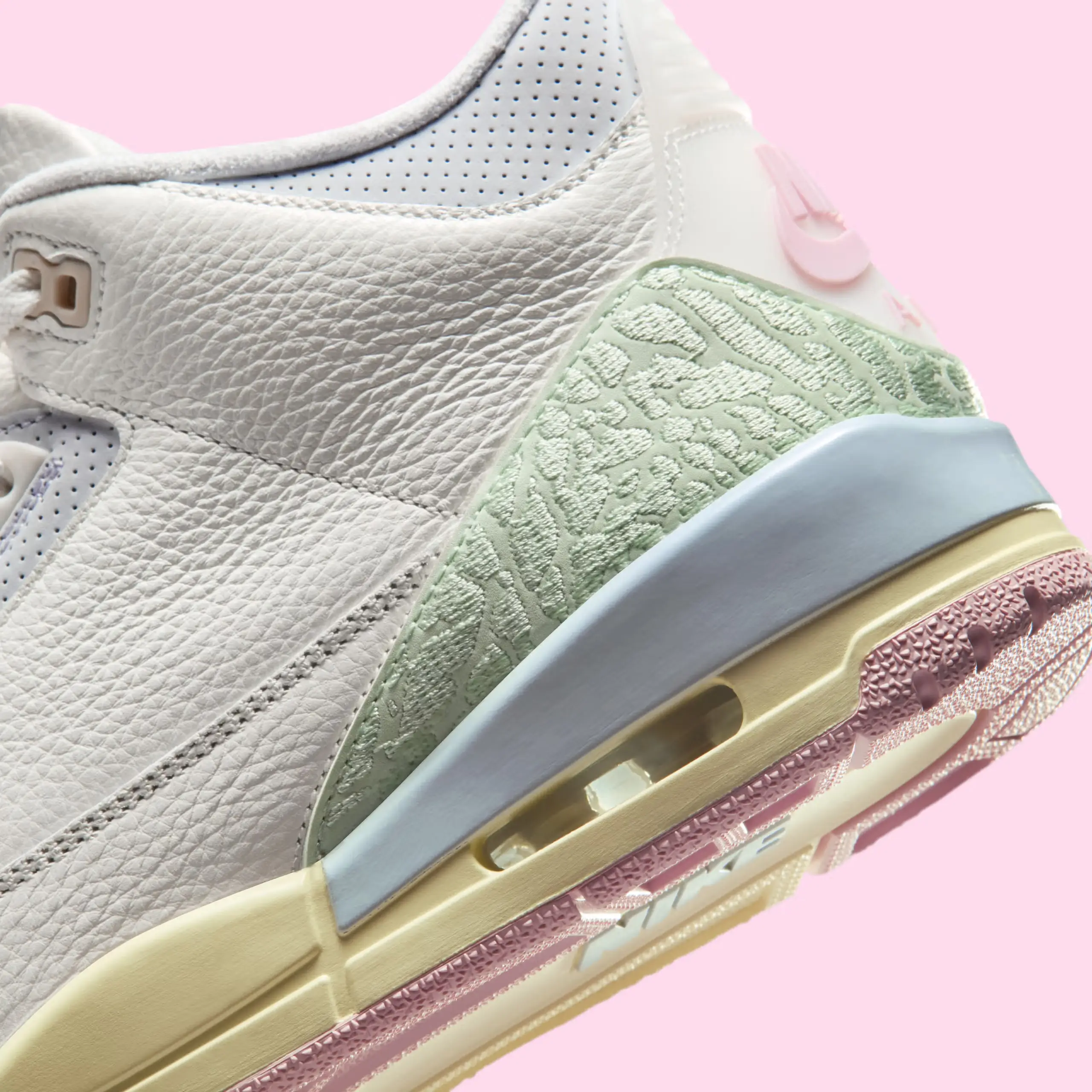 The defining characteristic of “Spring Is in the Air” is its palette. Instead of the bold contrasts that often define Air Jordan 3 releases, this version operates within a muted spectrum—pastel hues, washed neutrals, and subtle gradients that evoke early spring light.