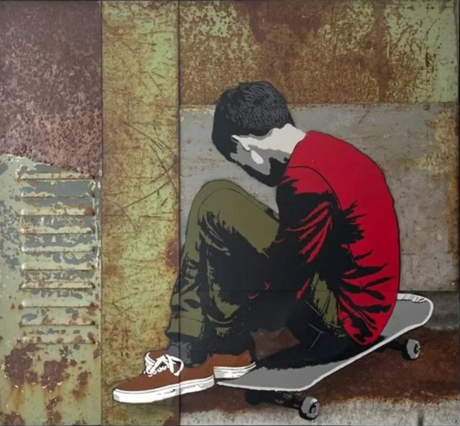 At first glance, Sad Skater appears deceptively as a simple figure in skater attire, sitting with an air of dejection. However, this simplicity is where Alias’s mastery shines. His stenciling technique, typically limited to a monochromatic palette, allows for a stark yet emotionally charged representation. In this piece, the skater’s body language slouched shoulders, downcast gaze, loosely hanging limbs suggests exhaustion, disappointment, or perhaps a deeper existential weariness.