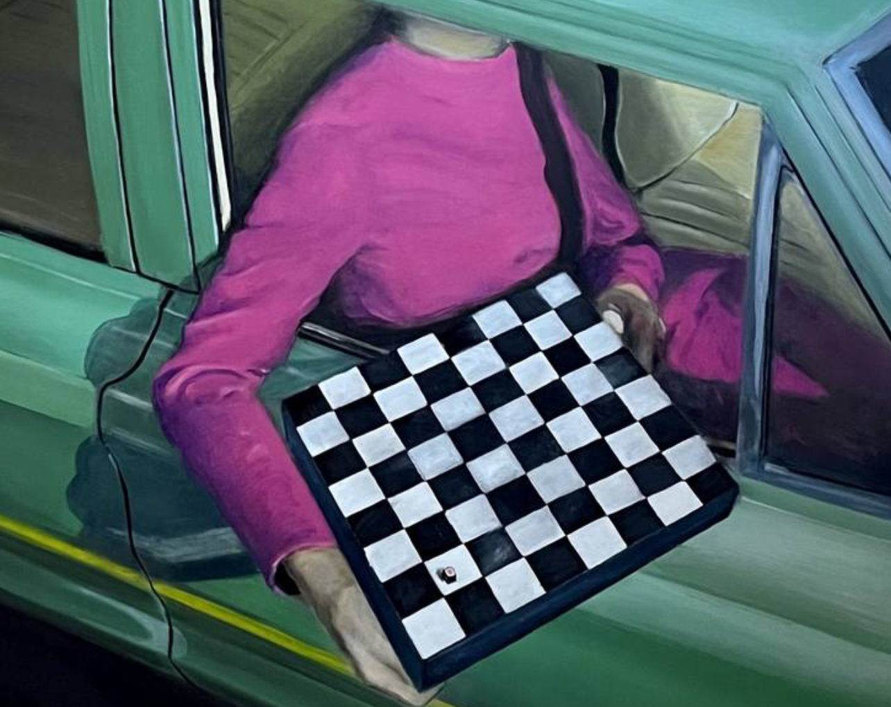 In Sushi Delivery, Ukrainian painter Anna Kryvych offers a scene as sharply cropped as it is psychologically charged. We see a green car. A woman in a saturated pink top. Her head, cropped from the frame. Her arm extends through the window, holding a black-and-white checkered board toward the viewer like an offering—or perhaps a quiet challenge.