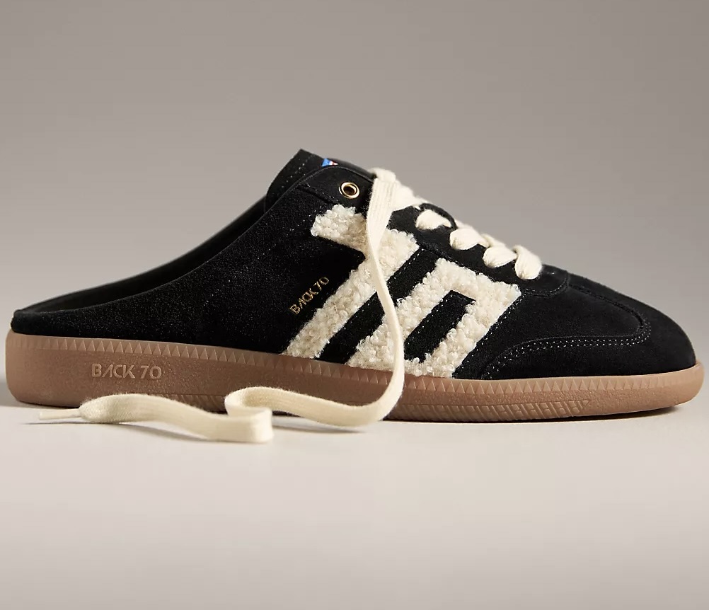 Its form is simple: a suede upper in black, marked with tactile stripes, and anchored by a gum sole that feels gleaned from the grainy photographs of 1970s sports halls. The heel, open and unbound, alters the rhythm of the shoe entirely, softening its edges, reshaping its use, and reimagining its place in everyday dress.