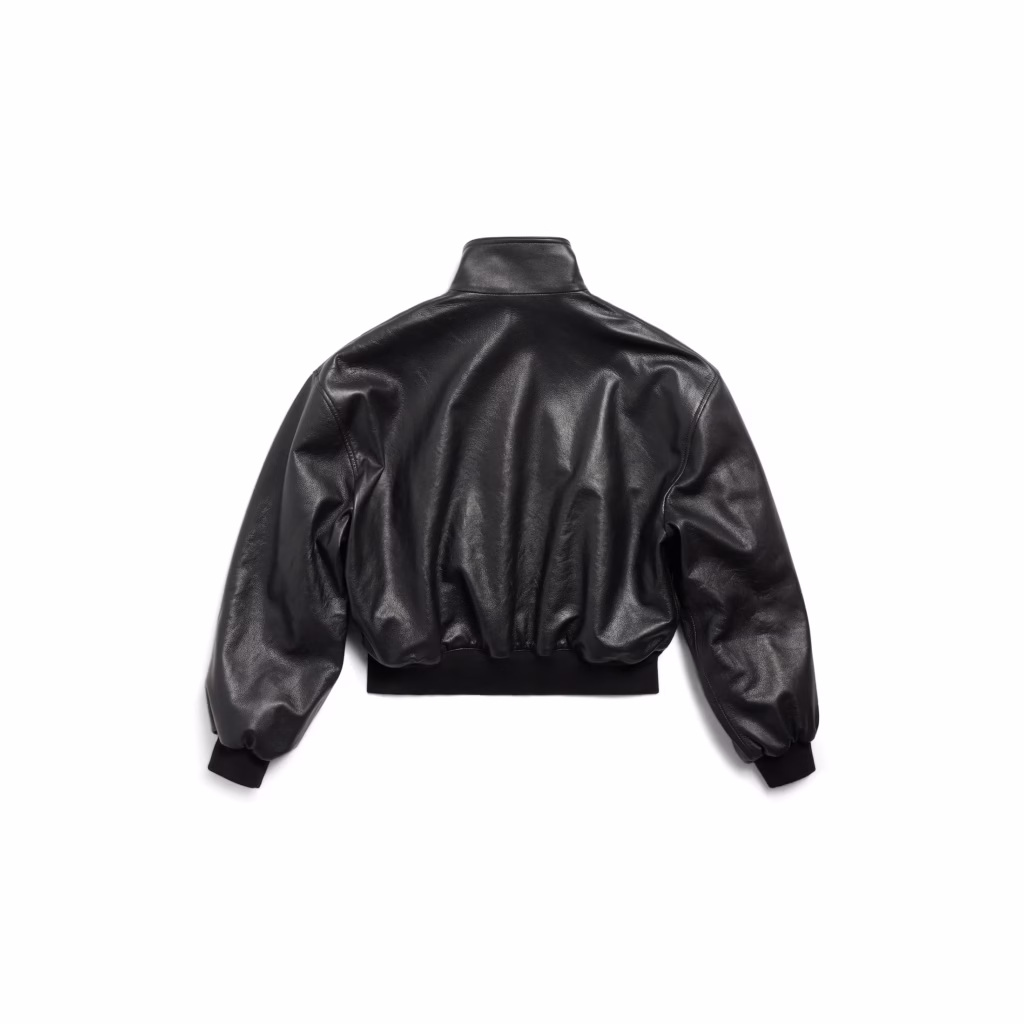 Balenciaga’s Garde-Robe collection emerges as a study in restraint. Conceived as a line of elevated wardrobe staples, it emphasizes precise tailoring, quiet silhouettes, and exceptional materials, all stripped of overt branding. Within this framework, the Blouson in black smooth semi-shiny grainy leatherstands as a cornerstone piece—an expression of minimalism that is neither reductionist nor simple, but rather an exercise in architectural rigor.