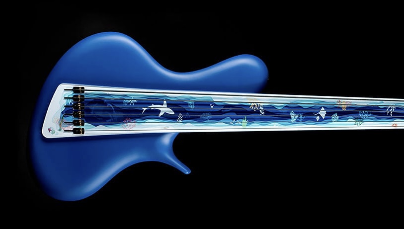 One of the most compelling aspects of this bass is its “Deep Sea” finish, which seems to shimmer and shift in the light, much like the surface of water. Achieving this effect requires multiple layers of translucent lacquer, each meticulously applied and sanded to create a finish that is both vibrant and reflective. The result is an instrument that visually evokes the mysterious depths of the ocean, with shades of blue, green, and black intermingling in a pattern reminiscent of underwater currents.
