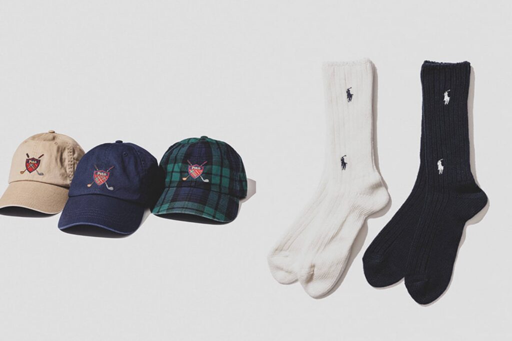 The caps, offered in Cafe Tan, Newport Navy, and Black Watch, complete the story. The front carries the same Polo Golf crest, while the back is signed discreetly with BEAMS embroidery above the strap—a quiet acknowledgment of authorship. The socks, available in navy and white combinations with miniature polo-player motifs, extend the narrative into smaller gestures of coordination.