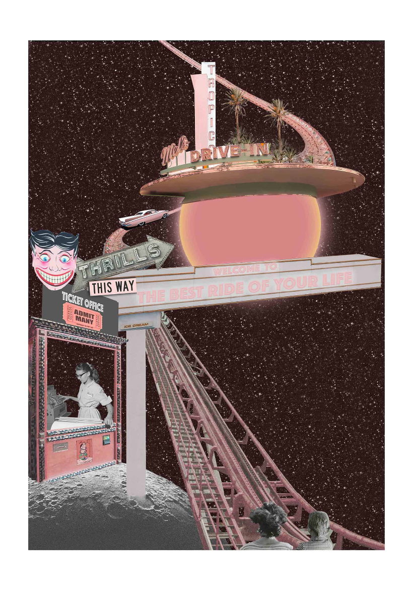 “Best Ride of Your Life” stands out for its dynamic composition, combining vintage cars, celestial imagery, and bold colors in a way that feels simultaneously nostalgic and futuristic. Alexeli’s use of collage techniques allows her to merge various visual styles—like photography, digital manipulation, and traditional cut-and-paste aesthetics—to construct a piece that feels like a visual journey through time and space.