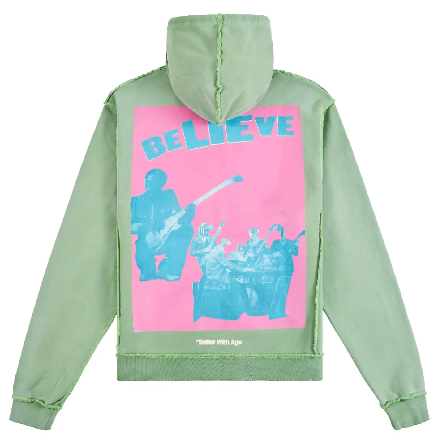 On the back, the “BELIEVE” graphic introduces a different register—bold, immediate, culturally resonant. It echoes the visual language of music merchandise and street graphics, but without direct reference. It feels familiar without being traceable.