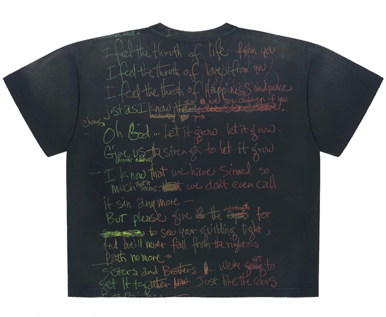 The back of the tee deepens this archive-like quality. Here, Hendrix’s handwritten lyrics are transcribed in multicolored chalk-like scrawls, layered and imperfect, as though pulled directly from a notebook page. Phrases such as “I feel the throth of life from you” and “Oh God … let it grow” echo his constant exploration of spirituality, love, and transformation. There is rawness in the handwriting: words are crossed out, edited, doubled back on—an insight into Hendrix’s process. The wearer is invited into that intimate space of creation, where even hesitation becomes poetry. This handwritten quality grounds the tee in authenticity, a reminder that great art often begins as fragile drafts scribbled in ink and pencil.