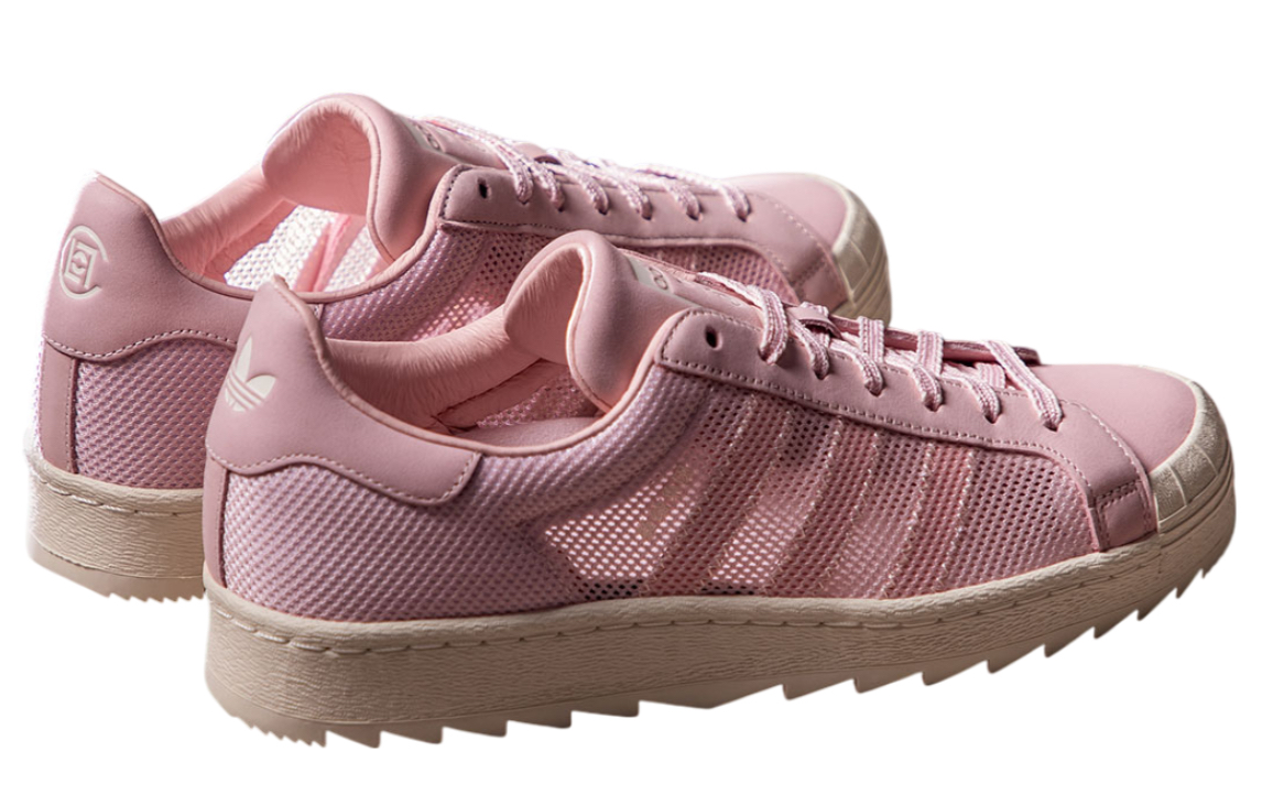 The sneaker’s base is a semi-transparent mesh, delicately tinted in soft pink. The toe cap—traditionally a hard rubber shell in classic Superstars—is rendered in frosted TPU, maintaining the silhouette’s signature form while allowing light to pass through it like a paper lantern. The Three Stripes on the sidewall are stitched in tonal pink thread, subtle enough to be almost spectral. Laces are flat and pale, while the heel tab bears the Clot logo alongside adidas Originals’ trefoil—a quiet fusion of East and West that nods to Clot’s DNA.