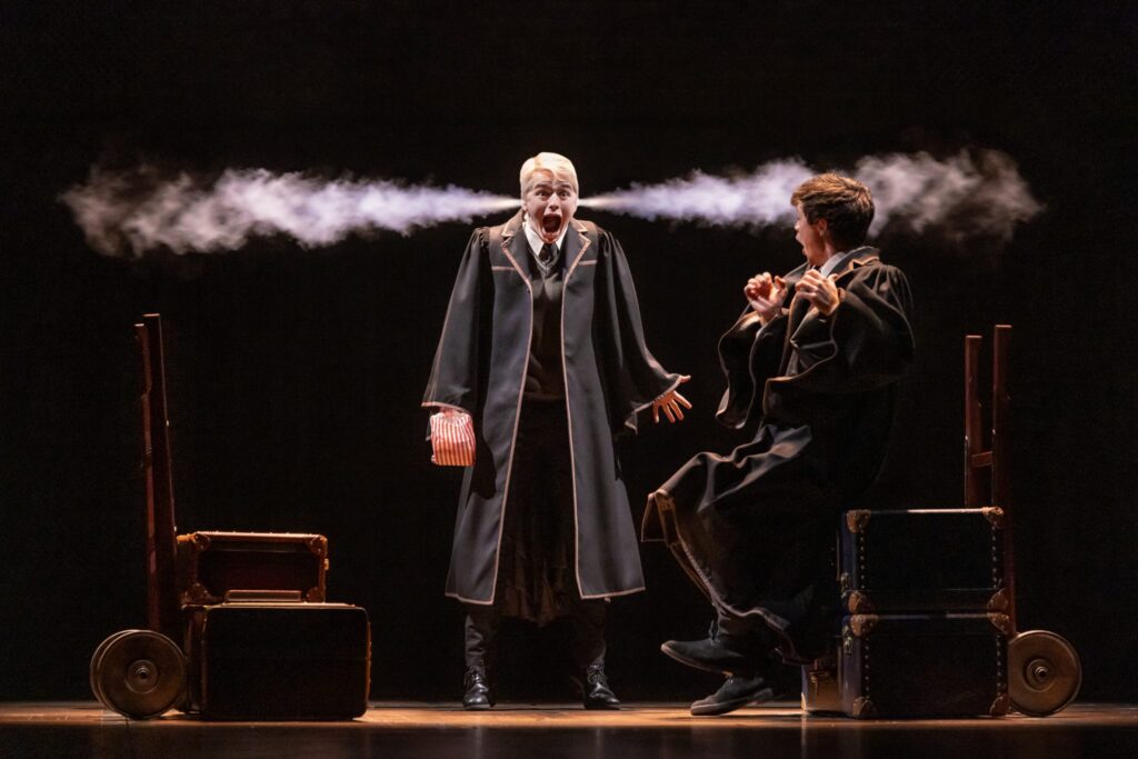One of the standout elements of this production is the chemistry between Aidan Close and Emmet Smith. Their portrayal of Scorpius and Albus is nuanced and layered, bringing a sense of authenticity and vulnerability to their characters that resonates deeply with the audience. Close’s Scorpius, in particular, is a revelation. He imbues the character with a delightful mix of humor, warmth, and fragility, making Scorpius one of the play’s most endearing figures. Smith, on the other hand, captures Albus’ inner turmoil and growing pains with remarkable subtlety. Together, they navigate the complexities of friendship, loyalty, and identity with a maturity that belies their youth, making their story arc one of the most compelling aspects of the play.