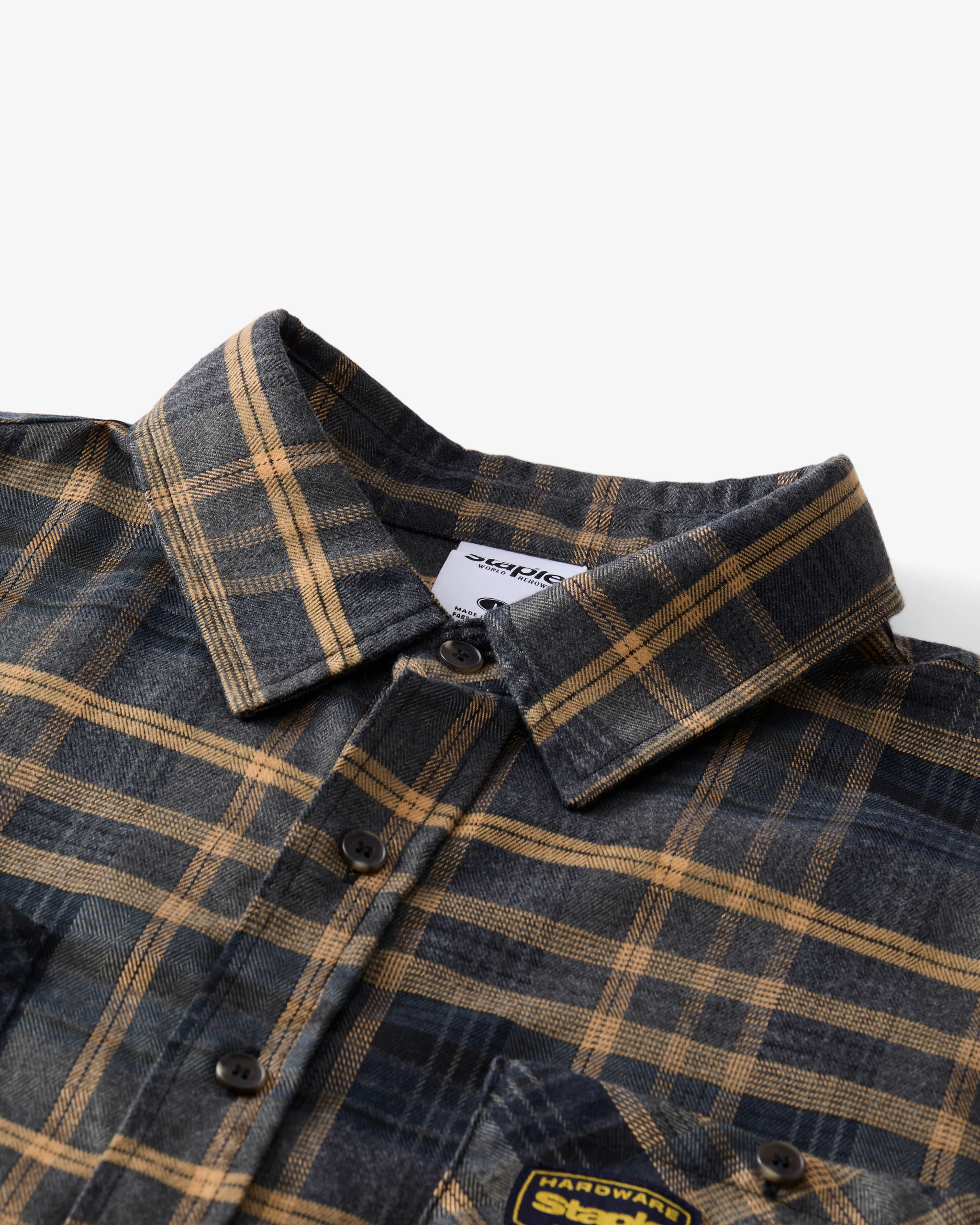 Its navy, tan, and charcoal plaid pattern keeps to tradition, while a woven “Hardware Staple” patch on the front pocket nods to the brand’s ethos of durability and cultural construction. It feels authentic as workwear but carries streetwear’s sharper edge.