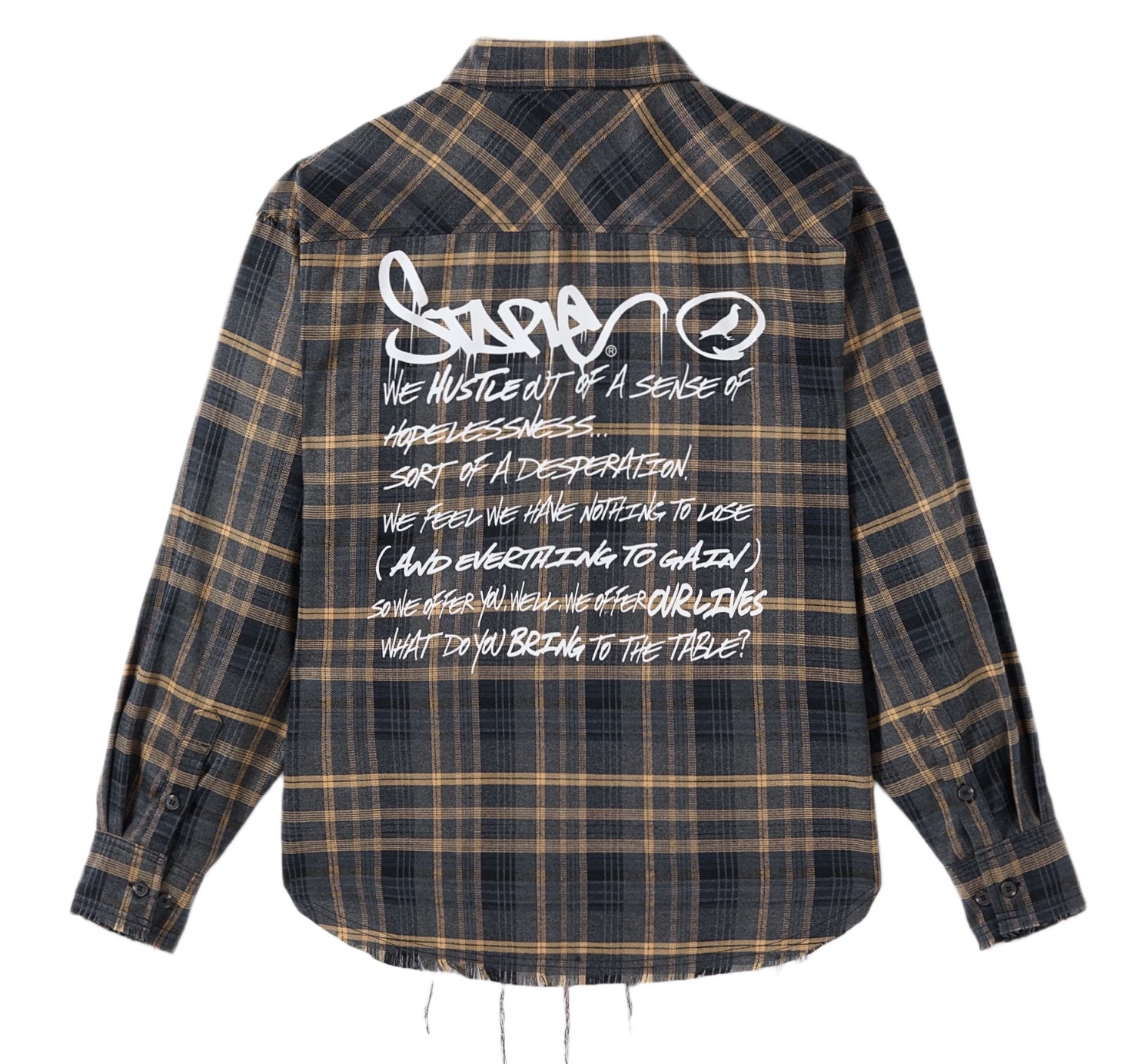 This is more than print—it’s philosophy. It positions the flannel as a wearable manifesto, echoing the urgency of survival and ambition that defines urban hustle culture. The rigid geometry of plaid contrasted with free-flowing graffiti script symbolizes resistance against imposed structures.