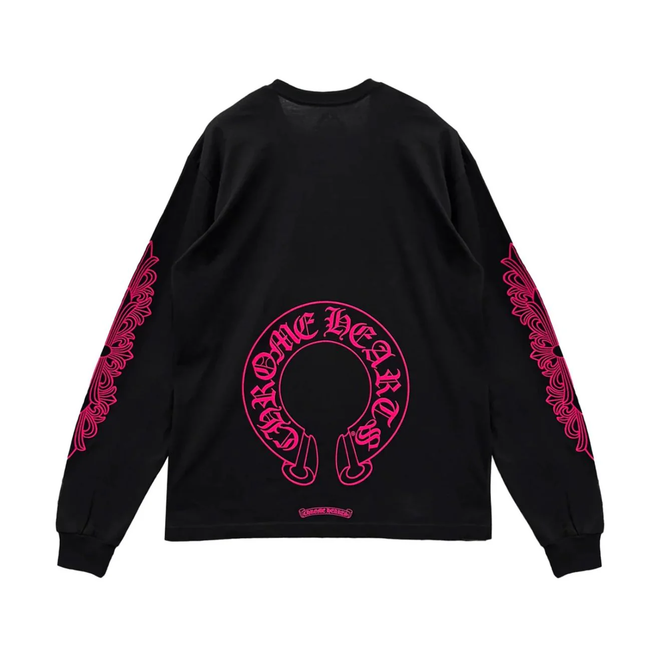 Chrome Hearts’ Black Pink Floral Longsleeve embodies the brand’s signature chic of haute craftsmanship and rebellious design. Made in the USA from premium cloth fabric, the piece is defined by a stark black base contrasted with delicate pink floral motifs — a rare soft flourish within the brand’s gothic repertoire. Chrome Hearts’ signature cross and dagger iconography are subtly integrated into the pattern, lending the piece its instantly recognizable edge.
