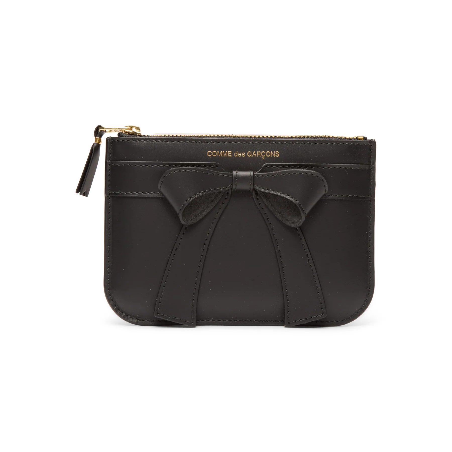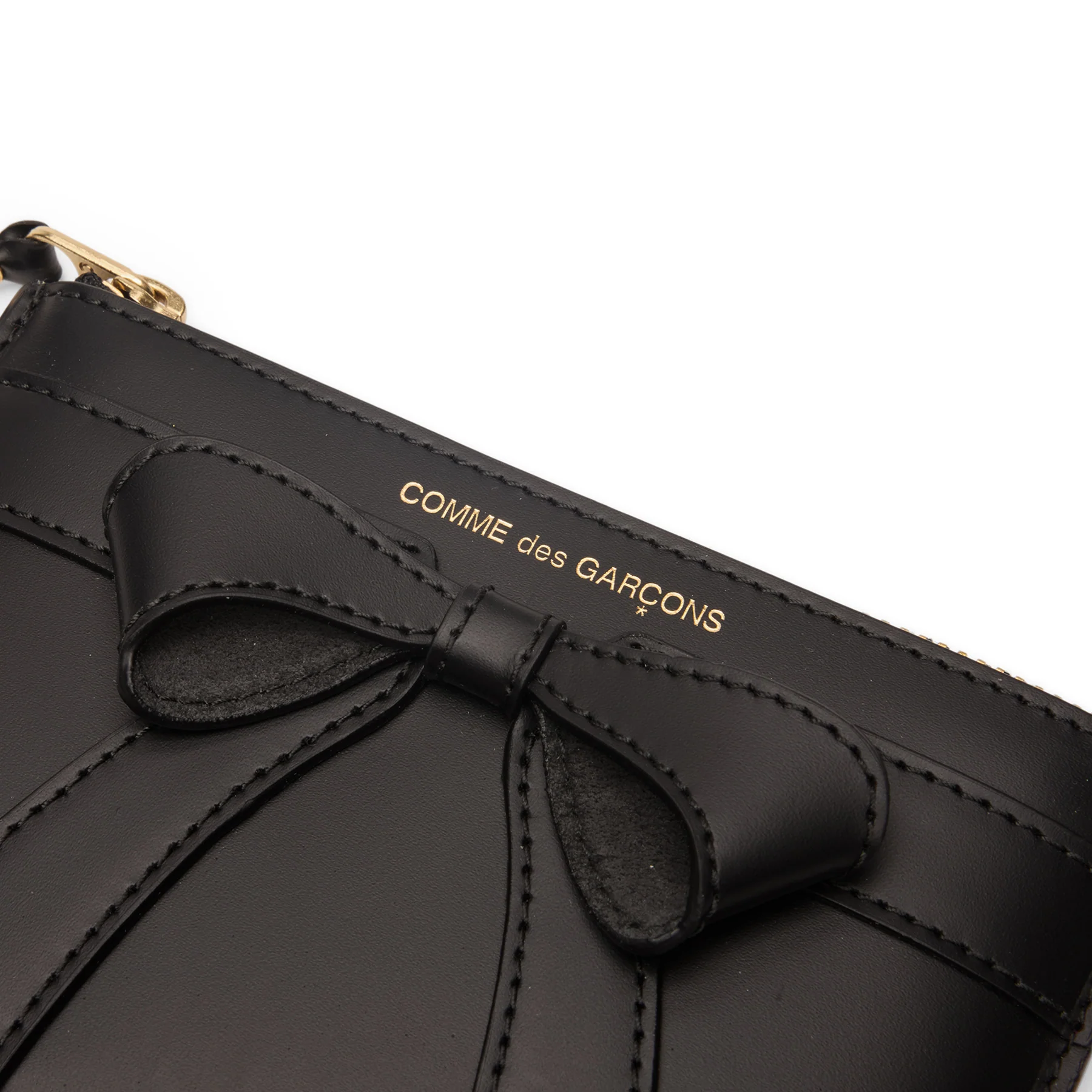 Above the bow, the COMME des GARÇONS logo appears stamped in delicate gold lettering. The placement is discreet yet recognizable, aligning with the brand’s preference for restrained branding rather than overt logos.