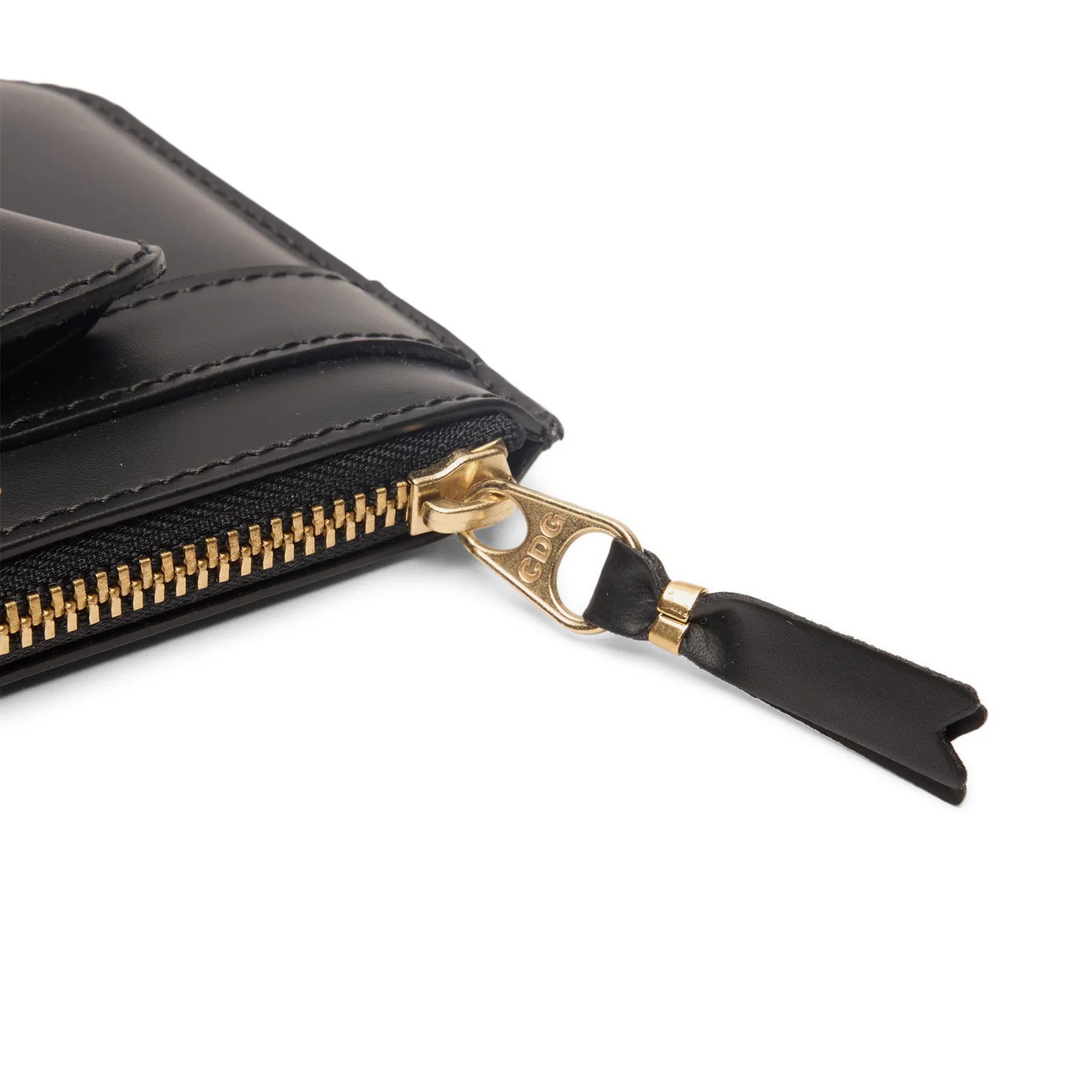 The pouch is constructed from smooth black leather, giving it a timeless, understated appearance. The matte finish highlights the precision of the stitching and the quality of the material, both hallmarks of Comme des Garçons’ leather goods collections.