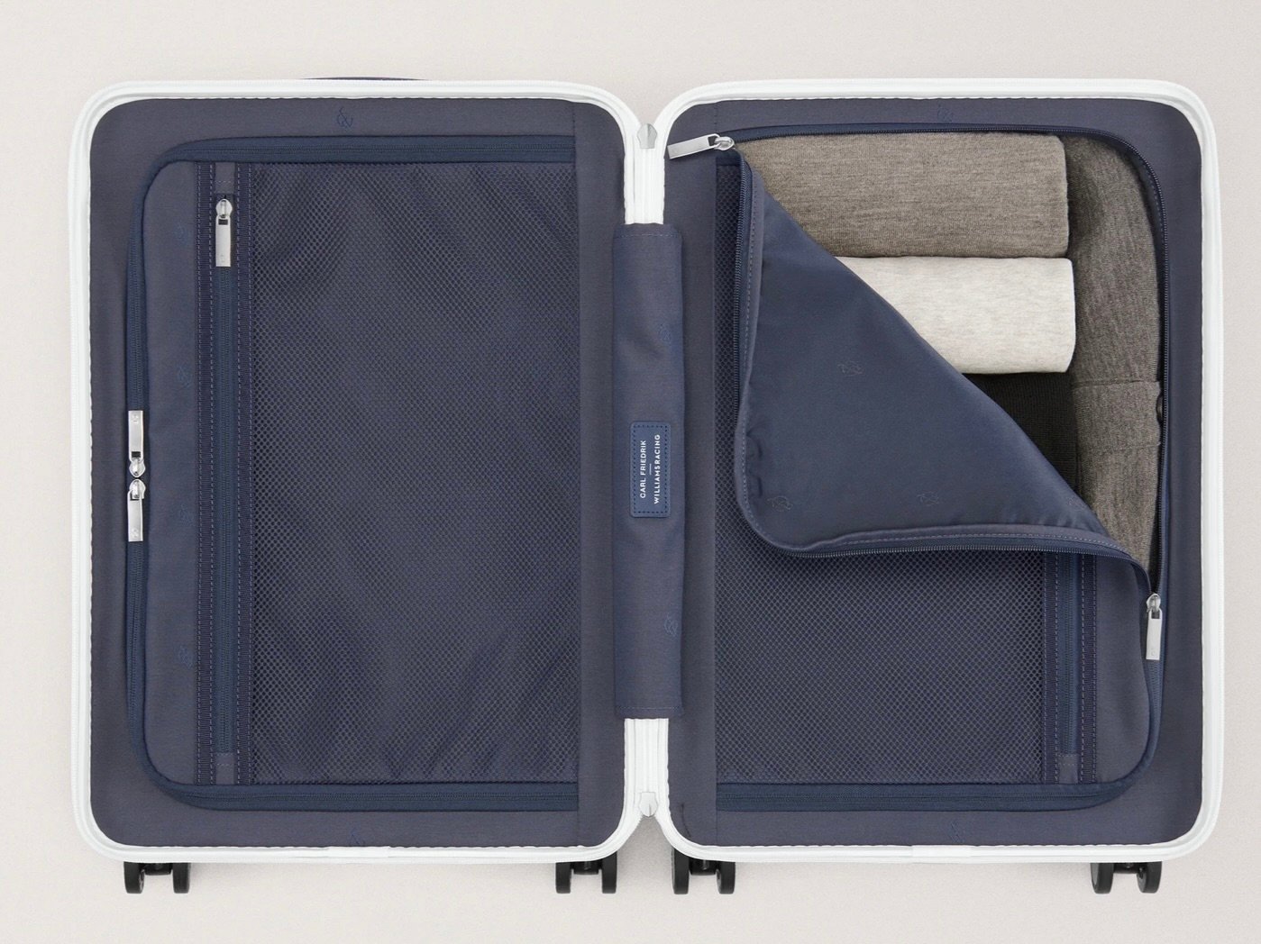 The first impression is striking. A crisp white surface conveys clarity and sharpness, while the navy trims along zippers, handles, and wheel arches call back to the team’s racing heritage. Branding is handled with subtle confidence: Williams Racing stamped into the side handle, Carl Friedrik sitting alongside it.