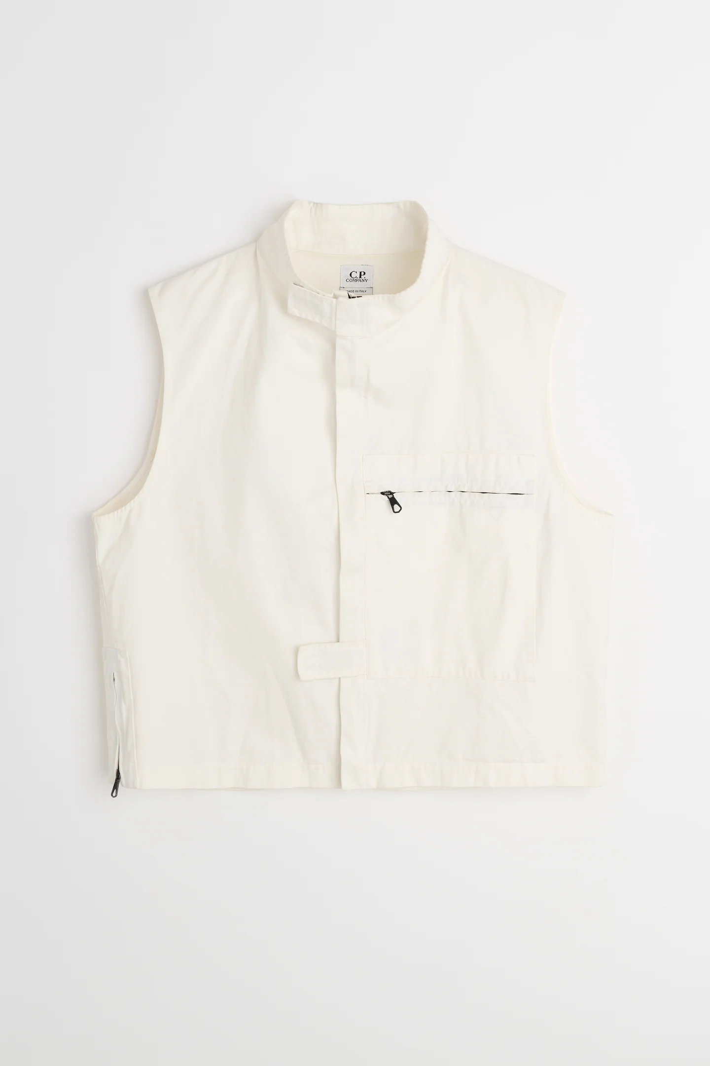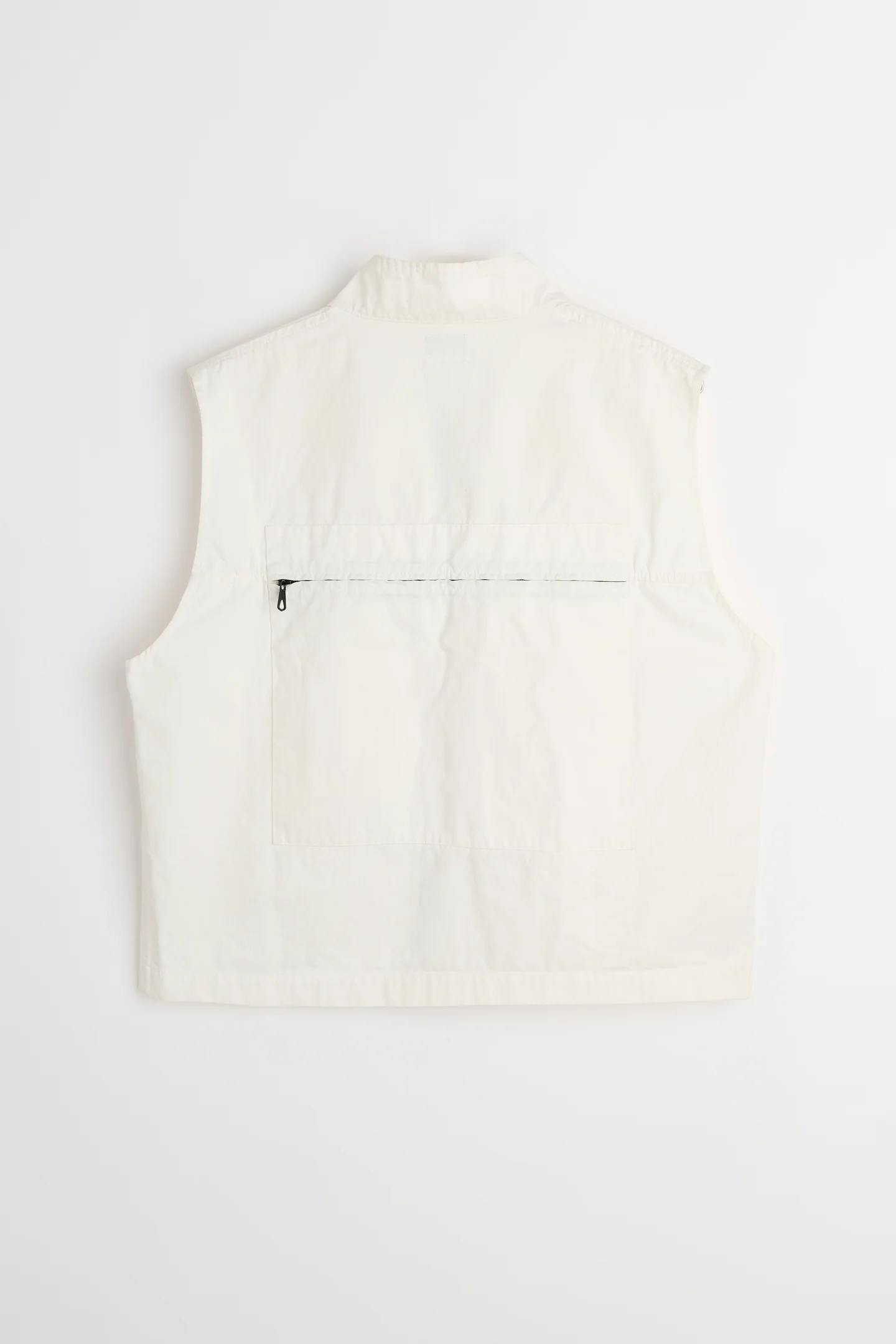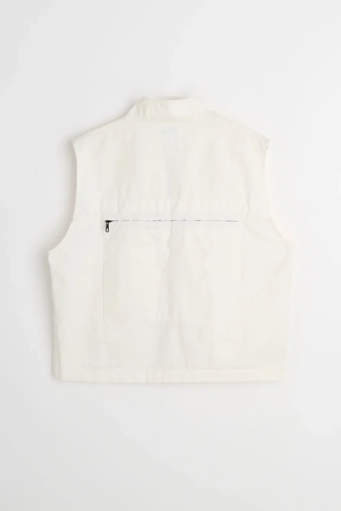 The piece resolves itself quickly, without ornament or narrative excess. A white gilet, cut short and squared, its surface uninterrupted except where function insists. There is no visible branding interrupting the field, no decorative stitching competing for attention. Instead, the garment operates through placement—through the exactness of seams, closures, and voids.