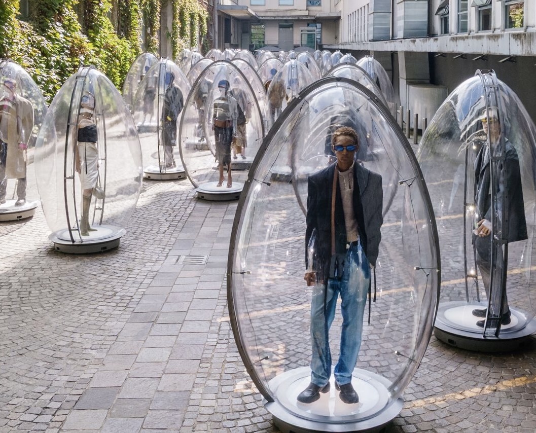 Runways are often synonymous with exclusivity, a coded language of access and hierarchy. Diesel challenges that model. By placing its SS26 collection in transparent capsules on city streets, the brand effectively dissolves the traditional runway. Each egg becomes both a protective case and a public display, a vessel that turns fashion into a spectacle accessible to all.