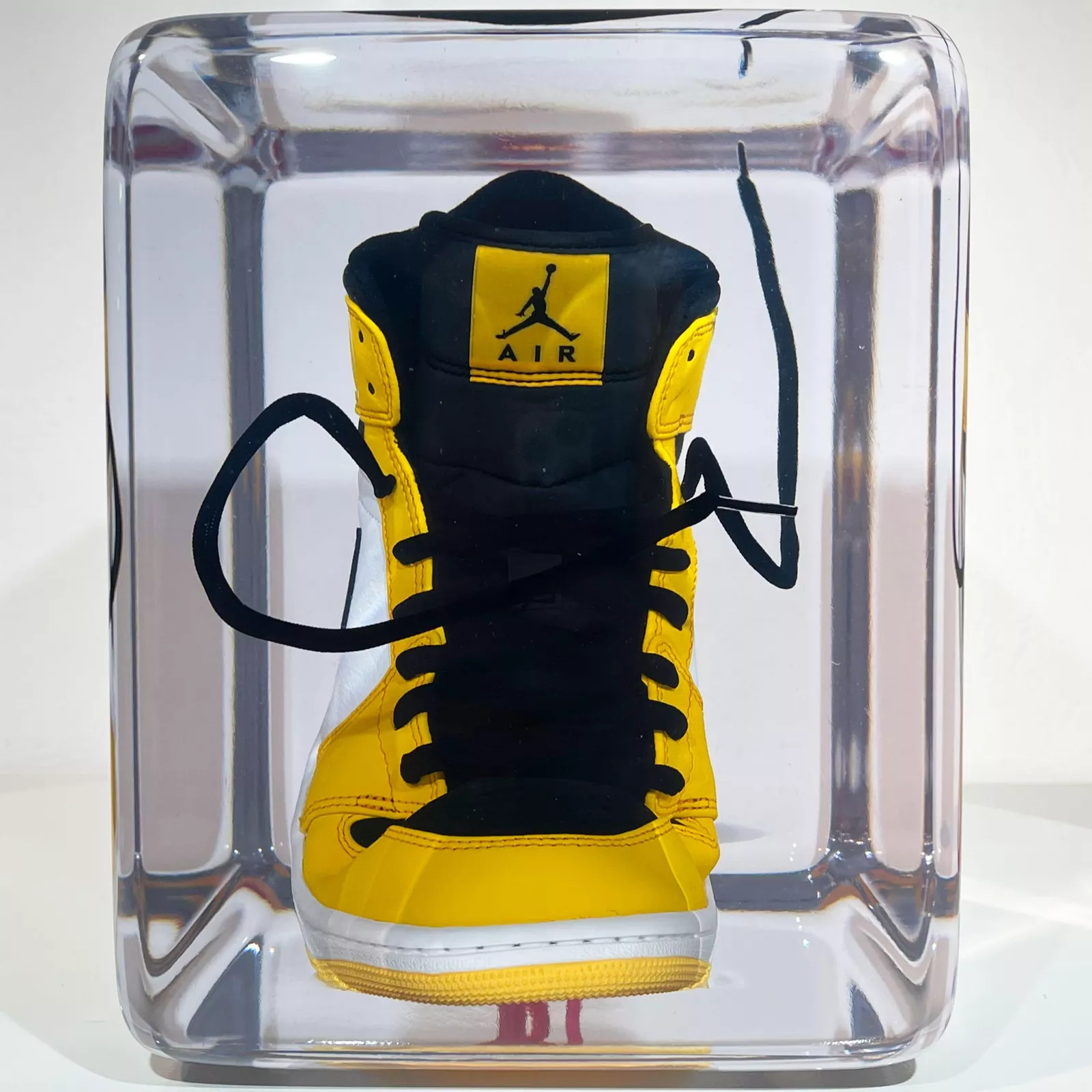 To select this particular shoe, Meneses isn’t simply nodding to footwear enthusiasts. He is conjuring the mythology of urban mobility, aspiration, and self-expression. The Jordan 1, particularly in yellow and black, references both speed and caution, freedom and danger. Within the resin, it ceases to be wearable—it becomes untouchable, a relic, both desirable and denied.