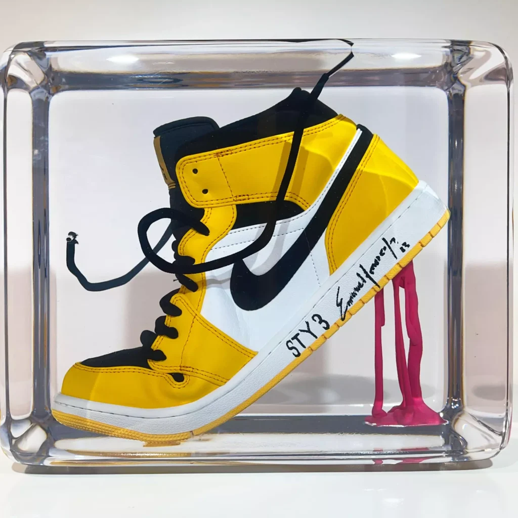Emmanuel Meneses has steadily built a reputation for reimagining cultural icons through sculpture and mixed media, reframing everyday commodities as philosophical artifacts. His 2024 work Sneakers & Gum exemplifies this trajectory. At its core is a Jordan 1 “Taxi Yellow”—a shoe loaded with decades of subcultural history—paired with a surprising, almost play element: a pink piece of bubblegum affixed to its outsole, all sealed within a transparent resin block.