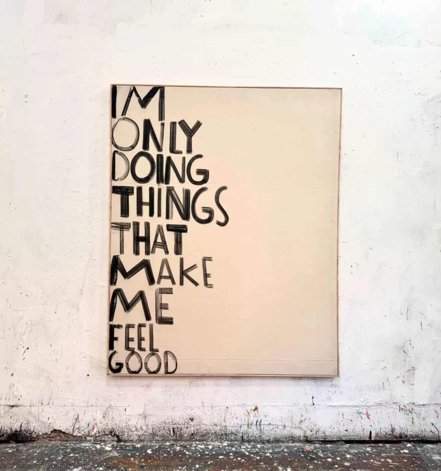 There’s a specific kind of clarity Eric Stefanski achieves when he paints words—an almost accidental serenity that arrives through humor, hesitation, and hand-painted candor. His 2025 work I’m Only Doing Things That Make Me Feel Good is one of those paintings that speaks plainly while revealing something far more unruly underneath. The phrase seems light, even playful, yet the painting holds the psychological density of a private journal entry left open on a kitchen table. There’s intention behind it, but also the vulnerability of a person admitting something they’ve avoided saying for a long time.