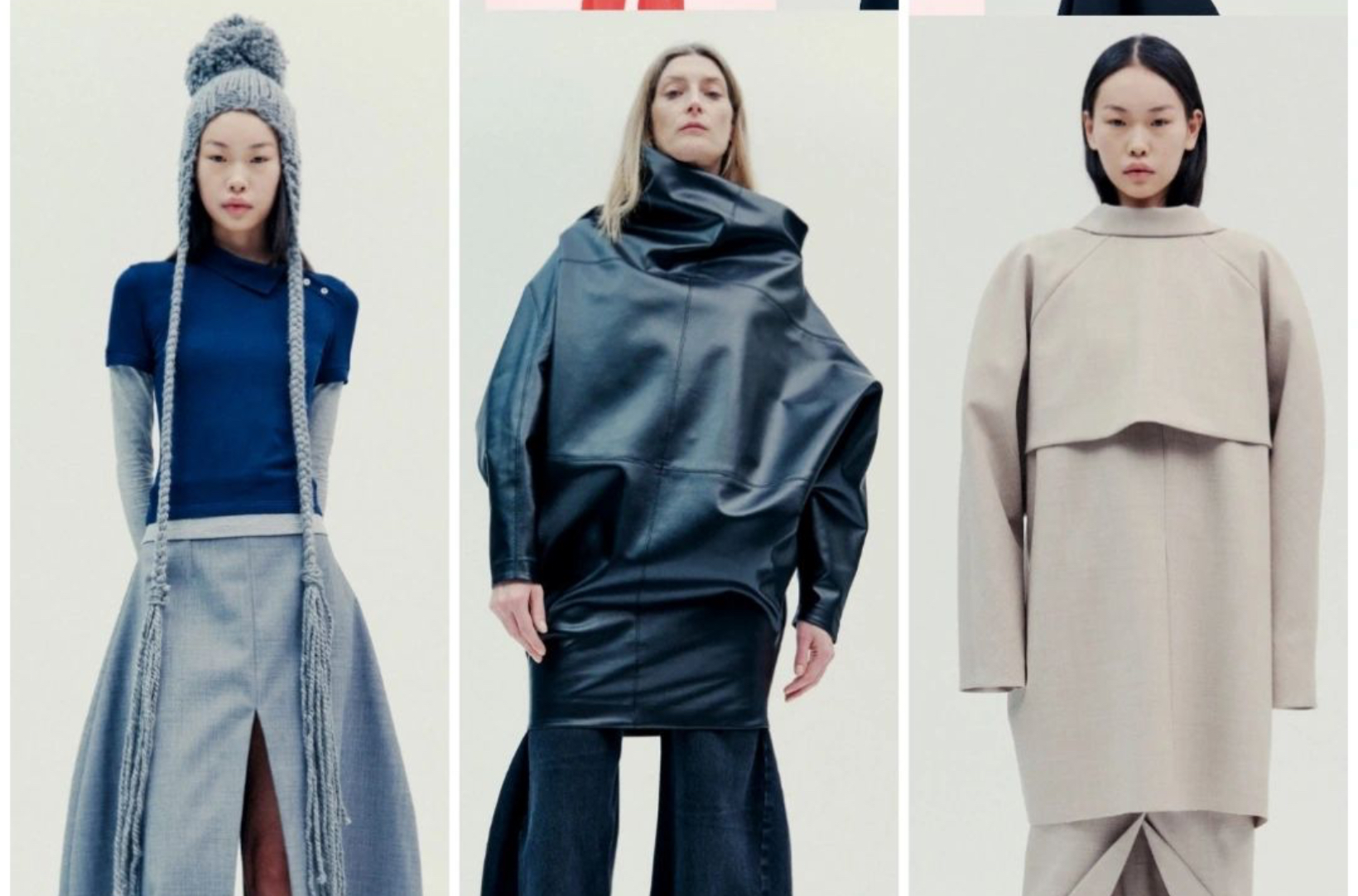 Models wearing A.W.A.K.E. Mode Fall 2025 showcasing sculptural silhouettes, asymmetrical tailoring, and hybrid garment