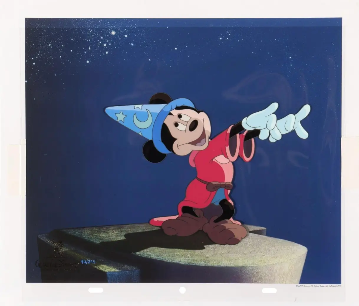 Lot 2102—Making Magic Hand-Painted Limited Edition No. 40/295 featuring Mickey Mouse as the Sorcerer’s Apprentice (2009)—exists precisely at that intersection. It is both homage and artifact, a re-materialization of a cinematic moment into a tactile, collectible object. In this edition, the ephemeral—animation projected onto light—becomes permanent, textured, and owned.