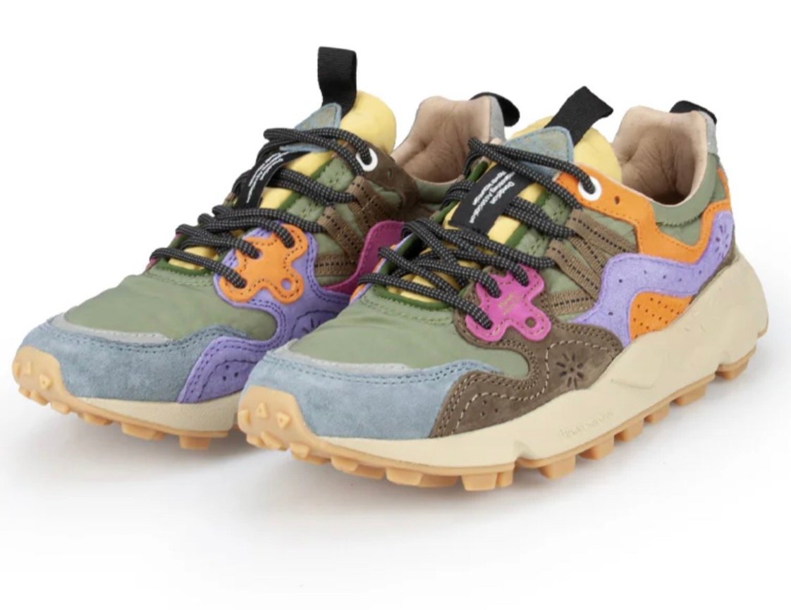 Among the highlights is the latest iteration of the Yamano 3 Uni, one of Flower Mountain’s signature silhouettes. This season’s versions blend sage green mesh with multicolored suede overlays — shades of lilac, ochre, and sky blue that recall the hues of wildflowers sprouting through stones. The combination feels organic and expressive, much like the brand’s philosophy of nature meeting design.