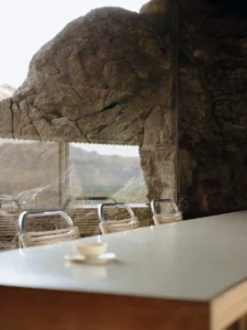 Frey House II is deceptively simple. It consists of a single main room with a kitchenette, a small sleeping area, and a bathroom. Yet the modesty of its footprint belies the sophistication of its design. The house is anchored to the mountain with a steel frame, and one massive boulder actually penetrates into the living space, forming a natural wall. This integration of the rock is not merely aesthetic; it symbolizes Frey’s commitment to merging built form with the landscape.