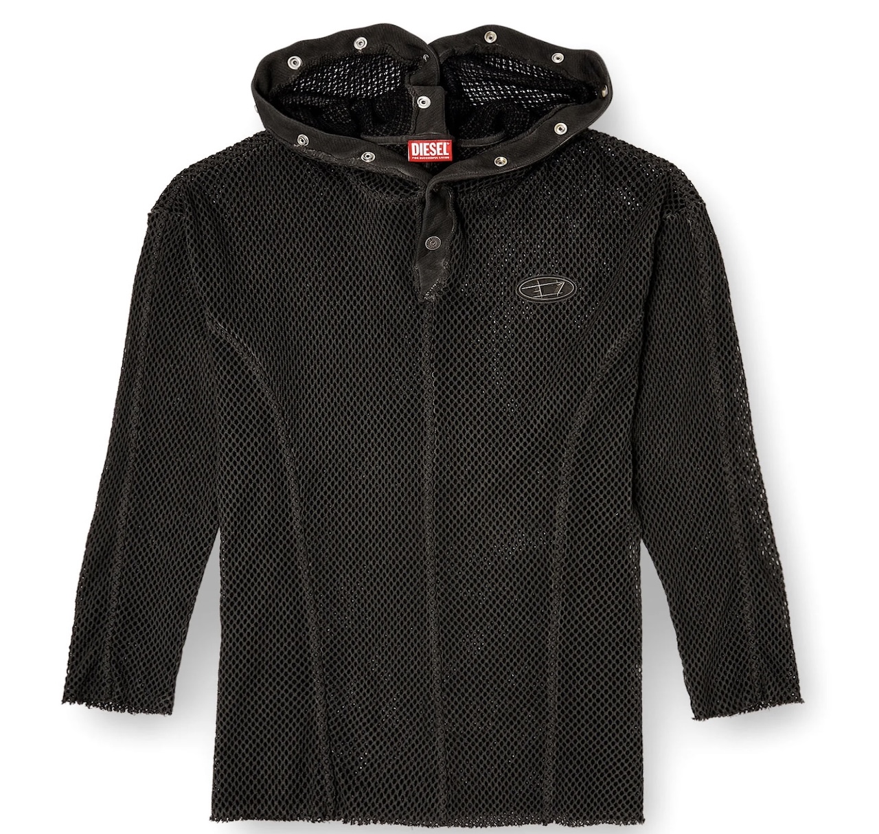 Every detail reinforces this shared narrative. Diesel’s iconic red tab grounds the garment in decades of denim-driven subversion, while Thug Club’s futuristic insignia claims space for the next wave. Mesh and closure work in tension: one exposes, the other conceals. This paradox is not a flaw but the essence of the design. Clothing here becomes dialect—two voices speaking in one hoodie.