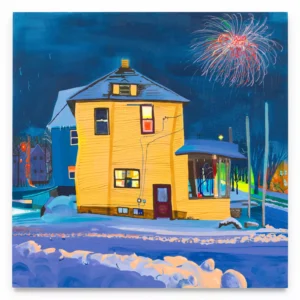If we look at Garland’s snowy yellow house beneath a burst of fireworks, the connection sharpens. The building’s crooked stance almost invites anthropomorphic interpretation: it leans, it stretches, it gazes back at the viewer with glowing eyes of lit windows. Like Megan’s metaphorical tree, it becomes more than an object—it’s a body, a character, something charged with desire and lived presence. The fireworks above echo the comedic outburst: explosive, fleeting, uncontainable. Just as Megan’s line interrupts the rhythm of conversation with wild energy, Garland interrupts the stability of architectural form with painterly elasticity.