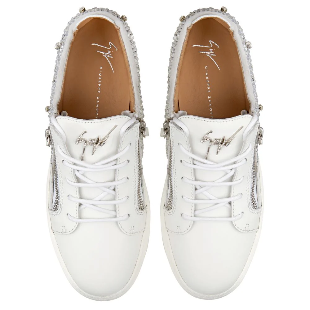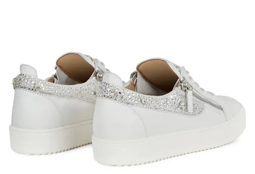 The design is a study in contrasts: the purity of white leather meeting the softness of suede, the austerity of form interrupted by crystalline glints. It’s unmistakably Zanotti — the kind of design that moves fluidly between Milanese atelier precision and streetwear relevance.