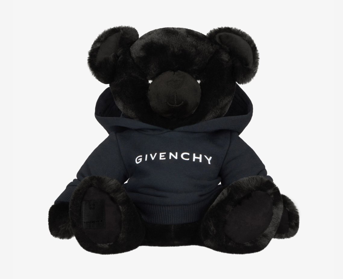 At just under a foot tall, the bear assumes the posture of something both huggable and haunting. Its jet-black pelt, sleek and dense, is more reminiscent of a rare evening coat than of anything born in a toy store. The GIVENCHY logo is embroidered not on its paw or ear as one might expect, but rather across its chest like a sigil—bold, declarative, and absolutely unapologetic.