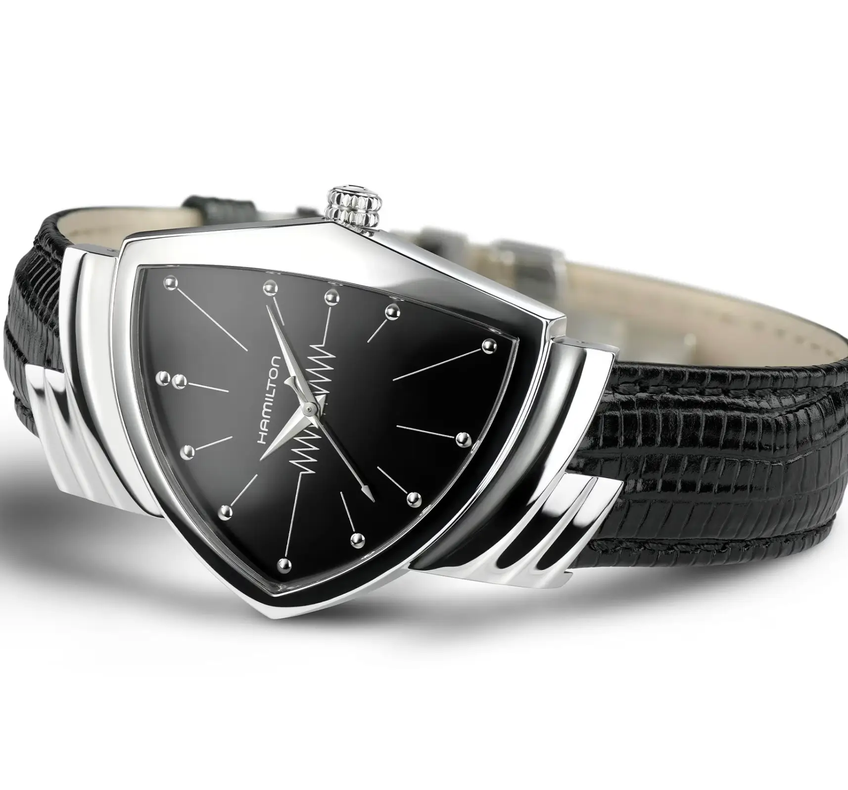 The modern Hamilton Ventura Quartz H24411732 revisits this lineage with precision. Its black dial is not merely a color choice; it is a stage. Against this surface, the polished indices and hands articulate clarity within complexity.