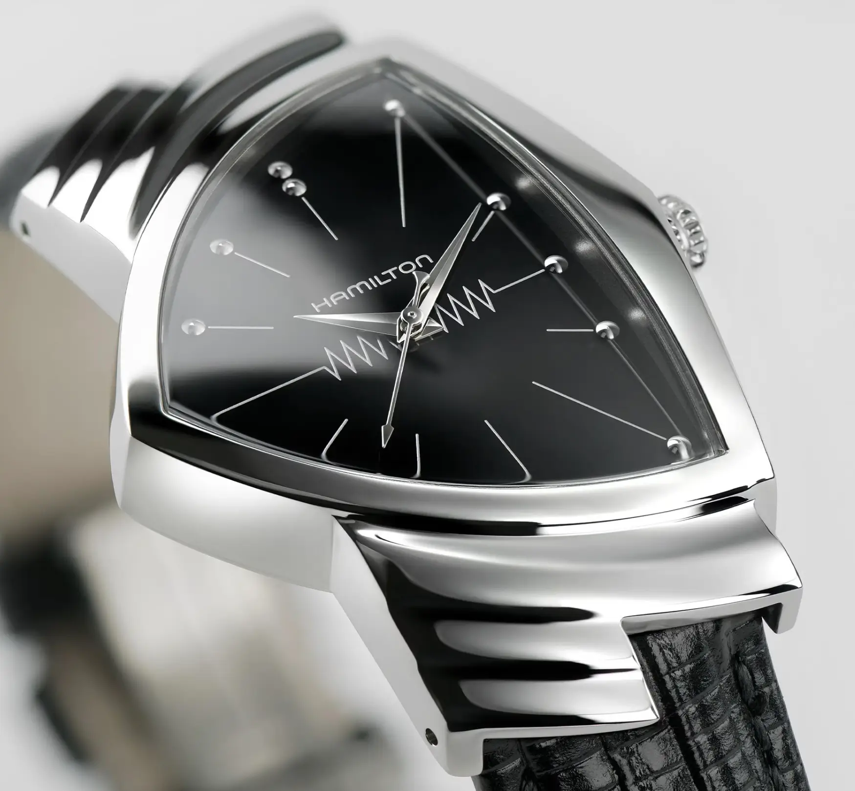 Placed adjacent to the narrative of the Hamilton Khaki Field Murph Auto—a watch defined by emotional storytelling and scientific symbolism—the Ventura reads as its conceptual counterpoint. Where the Murph is circular, legible, and grounded in continuity, the Ventura is angular, electric, and disruptive. Together, they articulate Hamilton’s dual identity: discipline and imagination, function and spectacle.
