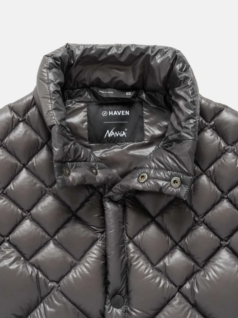 The HAVEN × NANGA Skyline Vest stands as a precise illustration of what happens when a Canadian performance imprint and a Japanese down specialist combine their philosophies into a single garment. On the surface, it reads as a clean, heritage-inspired down vest—lightweight, matte-shine nylon, diamond quilting, snap closures. In hand, and in wear, its construction reveals a more complex identity: technical performance drawn directly from mountaineering lineage, reinterpreted with HAVEN’s quiet, utilitarian design language.