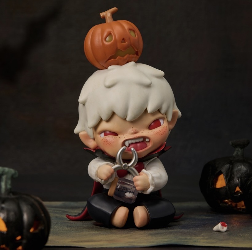 Then there’s the vampire boy, a small creature caught mid-pout, gnawing on a jar of blood with a pumpkin perched on his head. His frustration feels human, his eyes teary rather than menacing. Like all of Hirono’s monsters, he reveals the vulnerability hidden inside the mask.