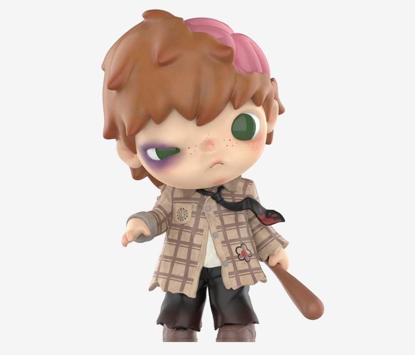 Among the cast, the fuzzy bunny figure stands as a symbol of twisted innocence. Clad in a tattered rabbit costume with one glowing red eye and a dripping hammer in hand, it’s both adorable and unsettling. The figure’s fluffy texture and stitched belly contrast with its expression of rage and defiance—a visual metaphor for the fragility of youth.