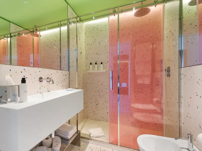Terrazzo surfaces continue here, but their interaction with light changes. Colored glass panels—often in soft pink or warm tones—filter light in a way that alters perception without overwhelming the space. This creates a gentle layering effect, adding depth while maintaining clarity.