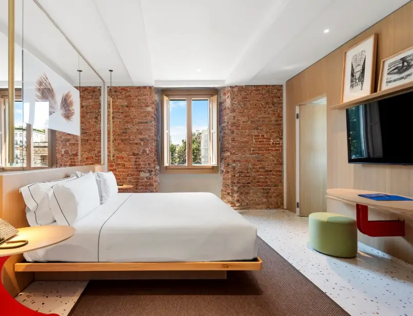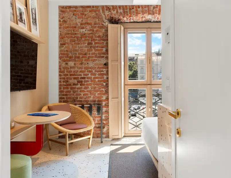 One of the most compelling aspects of Hotel Milù Milano is its architectural integrity. The building retains elements of its original structure, most notably through exposed brick walls that anchor the interiors in a tangible sense of history. These surfaces are not treated as decorative features, but as integral components of the space.