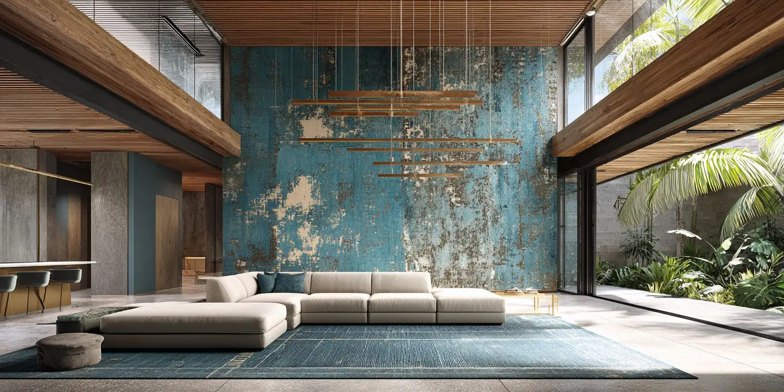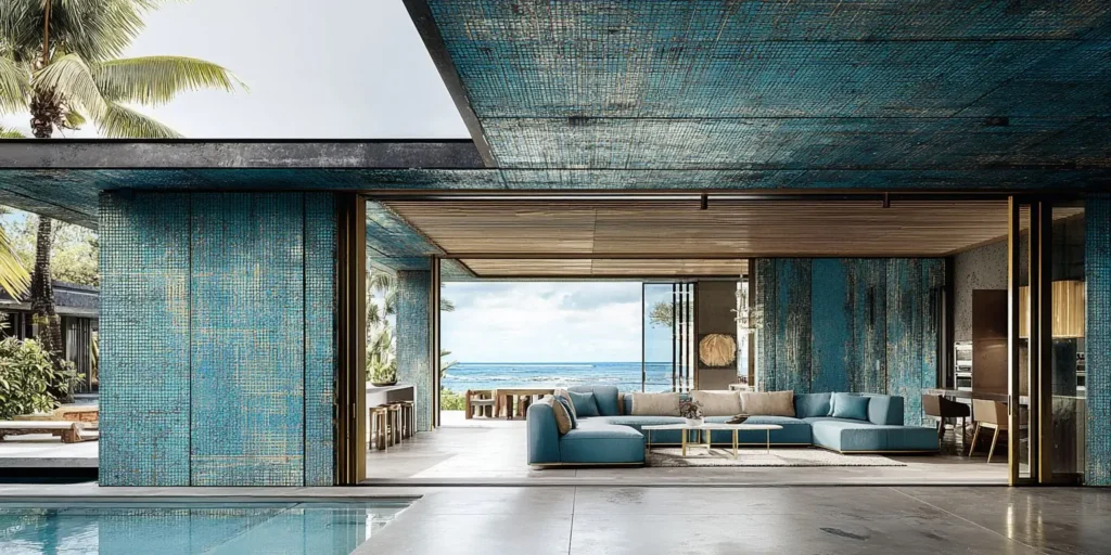 In open-plan tropical homes, acoustics often pose a challenge. Here, the denim weave not only dampens echo but also evokes the sensorial comfort of fabric — a bridge between clothing and construction. The result is an atmosphere that feels enveloping rather than cavernous, intimate rather than echoic.