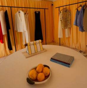 The brand’s installation is as architectural as it is atmospheric. The pop-up shop—a minimalist structure washed in sun-bleached tones—sits a few sandy strides from the shoreline. Its design pays homage to both Ibiza’s natural textures and Jacquemus’s signature Provencal simplicity. Think: raw wood shelving, terracotta accents, breezy textiles flowing with the sea breeze. The scent of Monoi floats in the air. The playlist hums with a curated mix of Bossa Nova, Parisian electro, and quiet French pop.