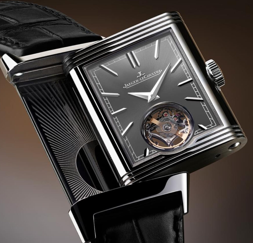 The Reverso’s iconic two-faced design is fully utilized in this piece, offering different functions on each side, adding to the watch’s versatility. One side reveals the hours and minutes in a classic yet refined layout, while the reverse side features a sophisticated tourbillon mechanism, a testament to Jaeger-LeCoultre’s technical mastery. The dual-face functionality not only serves a practical purpose but also emphasizes the geometric symmetry inherent to Art Deco design, where form and function are inextricably linked.