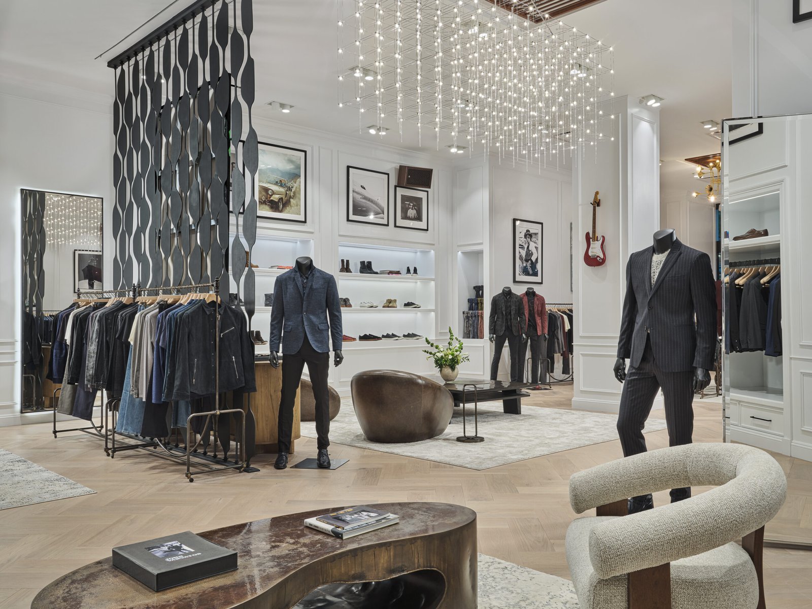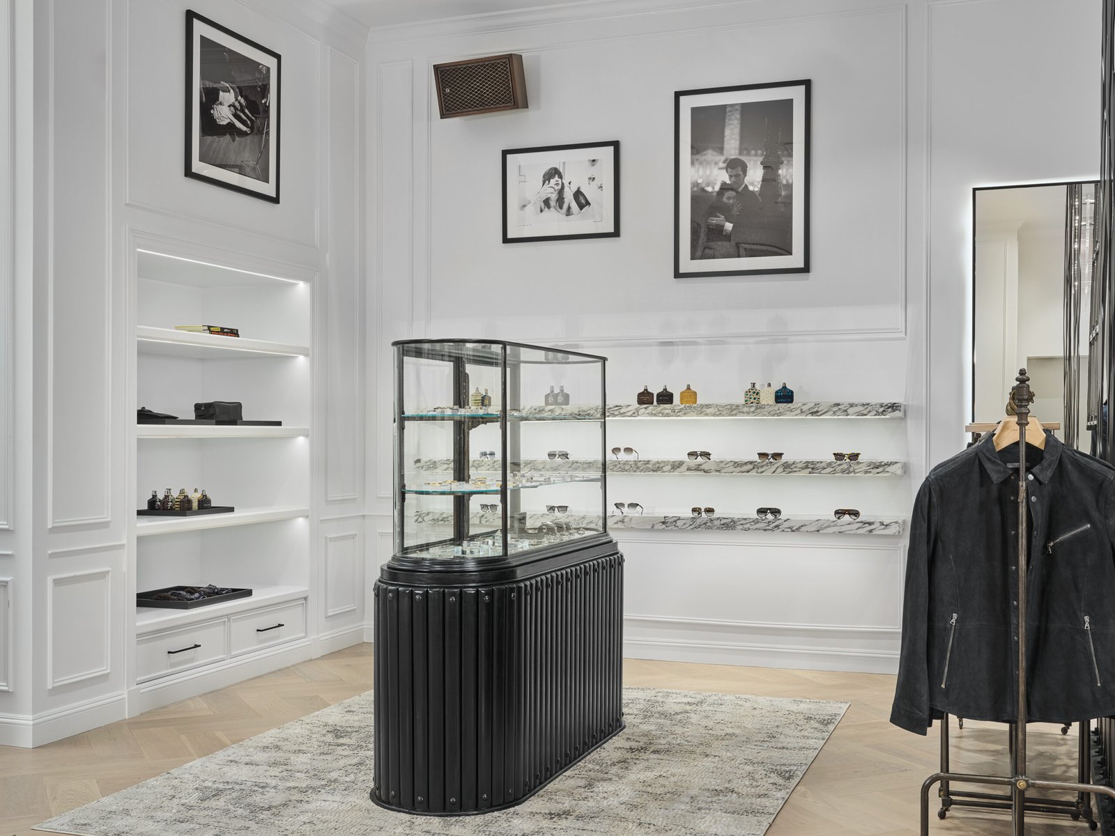 Varvatos was always part of that conversation, his stores embodying the romance of grit — where leather met silk, and rebellion was pressed into the seams. The new SoHo space continues that lineage with quiet precision: 13-foot ceilings, bronze brick screens, vintage rolling racks sourced from Paris, and Persian rugs that look like they’ve heard stories.