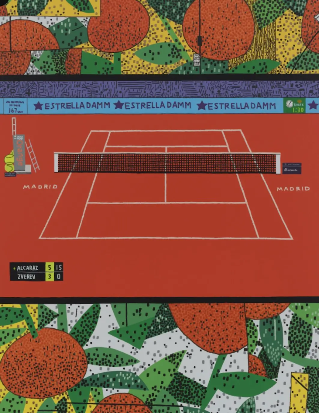 Color operates as the series’ most immediate and seductive force. Tennis, perhaps more than any other sport, offers a spectrum of highly controlled color environments. Wimbledon’s green, Roland Garros’s clay red, the saturated blues of hard courts, and the increasingly experimental palettes of indoor tournaments provide a ready-made field for chromatic exploration.